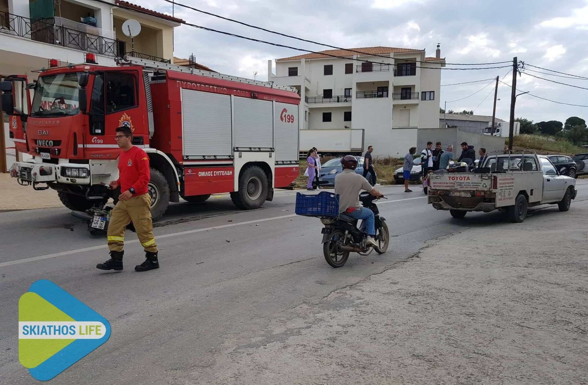 Ατύχημα στις 9 το πρωί έγινε στην περιφερειακή οδό Σκιάθος – Κουκουναριές με 21χρονη γυναίκα οδηγό μηχανής να χάνει τον έλεγχο της από άγνωστη μέχρι στιγμής αιτία και να σφηνώνεται στους μπροστινούς τροχούς Πυροσβεστικού Οχήματος βαρέως τύπου που εκείνη την ώρα είχε κατεύθυνση προς το Πυροσβεστικό Κλιμάκιο Κουκουναριών.