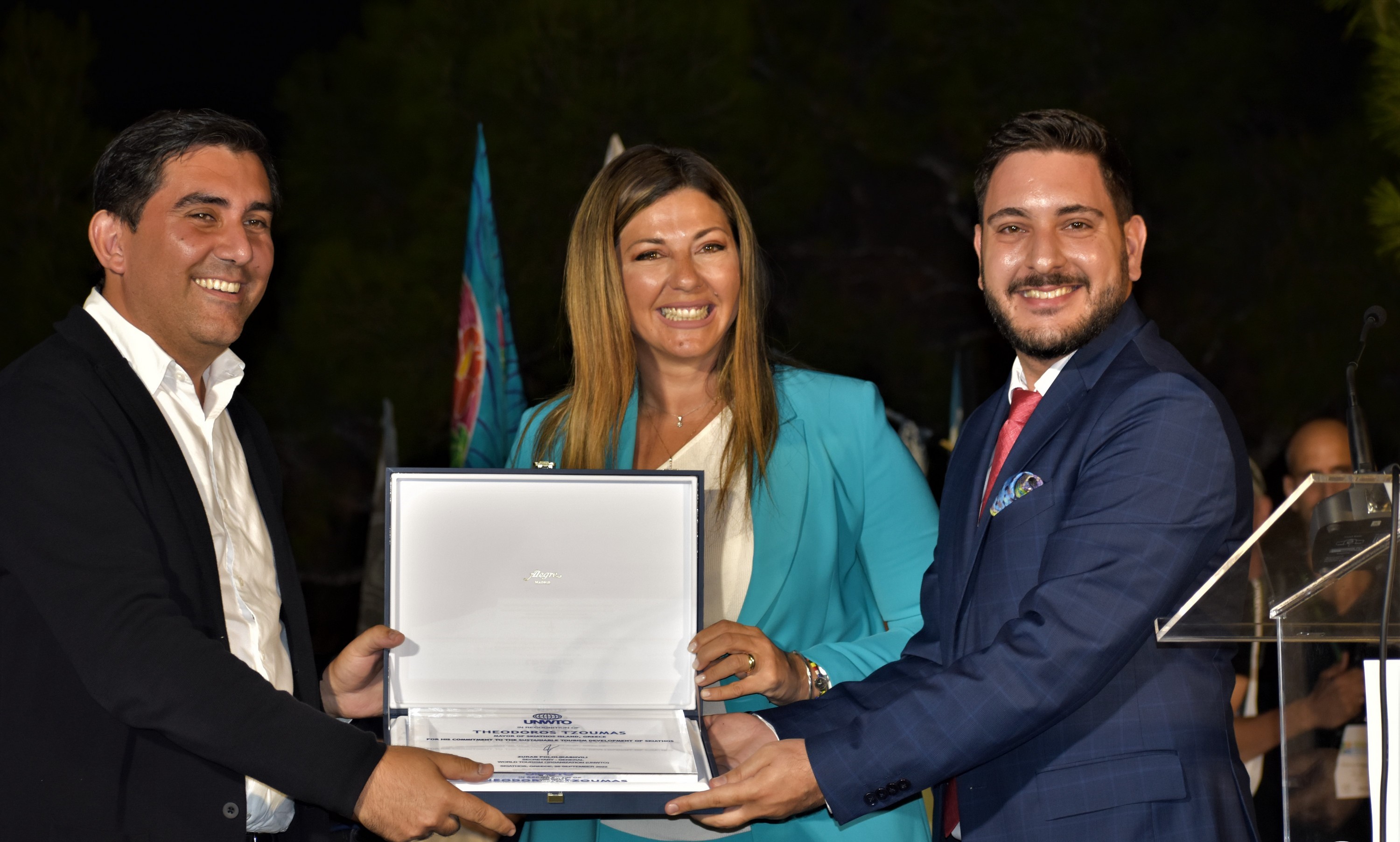 Τέλος, χαιρετισμό απηύθυνε ο Senior Project Specialist του Παγκόσμιου Οργανισμού Τουρισμού, Νικόλαος Γκολφινόπουλος, ο οποίος αναφέρθηκε στη συνεργασία του ΠΟΤ με τον Δήμο Σκιάθου, τον πρώτο Δήμο της χώρας με τον οποίο συνάπτει σύμφωνο συνεργασίας με σκοπό να αξιολογήσουν τη στρατηγική μάρκετινγκ του νησιού και να προτείνουν προσαρμογές και απαραίτητες βελτιώσεις, με ιδιαίτερη έμφαση στη δέσμευση του προορισμού να χρησιμοποιεί τον τουρισμό ως μοχλό αειφόρου ανάπτυξης. Μάλιστα τόνισε ότι ο ΠΟΤ υποστηρίζει με ιδιαίτερη χαρά και συμμετέχει στο Συνέδριο αφού μεταξύ άλλων ο ΠΟΤ εστιάζει στους «δρόμους -routes» και συγκεκριμένα στην ανάπτυξη των δικτύων «δρόμων» στον κόσμο και πώς αυτοί οι πολιτισμοί μπορούν να αξιοποιηθούν προς όφελος της τουριστικής ανάπτυξης και του τουριστικού προϊόντος σε 36 χώρες ανά τον κόσμο, μεταξύ των οποίων και η Ελλάδα. Στη συνέχεια ο εκπρόσωπος του ΠΟΤ μαζί με την Υφυπουργό Τουρισμού παρέδωσαν στον Δήμαρχο τιμητική πλακέτα του Γενικού Γραμματέα του ΠΟΤ Zurab Pololikashvili για την αφοσίωση του Δήμου στην βιώσιμη τουριστική ανάπτυξη της Σκιάθου.