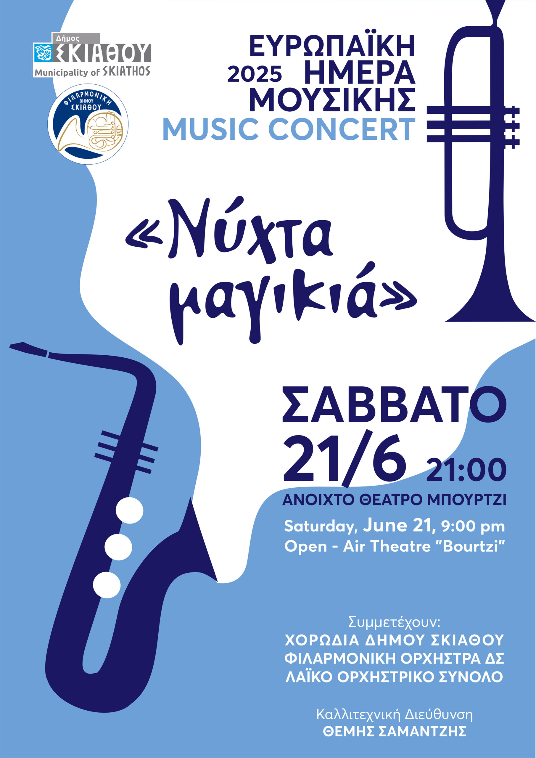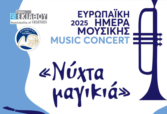 Με τη συναυλία «Νύχτα Μαγικιά», γιορτάζει ο Δήμος Σκιάθου την Ευρωπαϊκή μέρα μουσικής το Σάββατο 21 Ιουνίου στις 21:00 στο Ανοιχτό Θέατρο στο Μπούρτζι με ελεύθερη είσοδο.