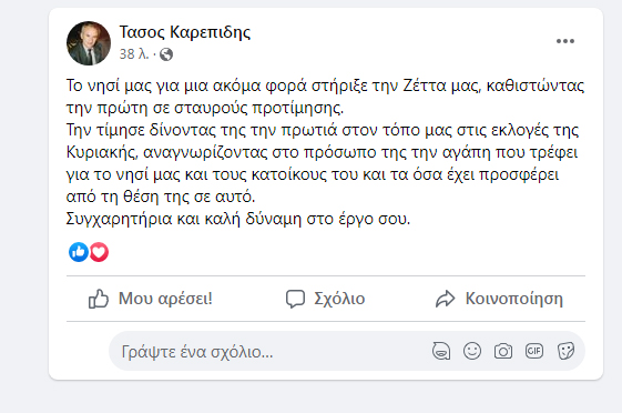 Περισσεύει ο πολιτικός πολιτισμός στη Σκιάθο, όπου αμέσως μετά τις εθνικές εκλογές, ο γραμματέας της τοπικής οργάνωσης του ΠΑΣΟΚ-ΚΙΝΑΛ Τάσος Καρεπίδης, συνεχάρη την Βουλευτή Μαγνησίας και υφυπουργό Παιδείας κα Ζέττα Μακρή για την πρωτιά της στο νησί. Σύμφωνα με τα αποτελέσματα, στο Δήμο Σκιάθου, η κα Μακρή έλαβε 952 ψήφους κατακτώντας την πρώτη θέση στην προτίμηση των κατοίκων του νησιού. Ο Τάσος Καρεπίδης, έκανε σχετική ανάρτηση στο facebook, η οποία προκάλεσε σφοδρές αντιδράσεις ανάμεσα στα στελέχη του ΠΑΣΟΚ στη Σκιάθο, με τον υποψήφιο Βουλευτή Μαγνησίας Νίκο Τζούμα να τον εγκαλεί γι’ αυτή του την ενέργεια, με τον κ. Καρεπίδη να αποσύρει στη συνέχεια τη συγκεκριμένη ανάρτηση. Διαβάστε παρακάτω τι ανέφερε ο κ. Καρεπίδης στην επίμαχη ανάρτησή του: