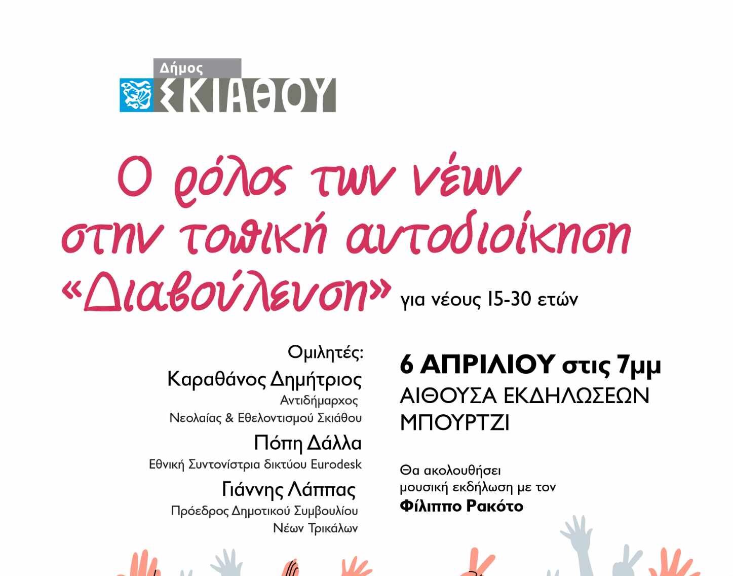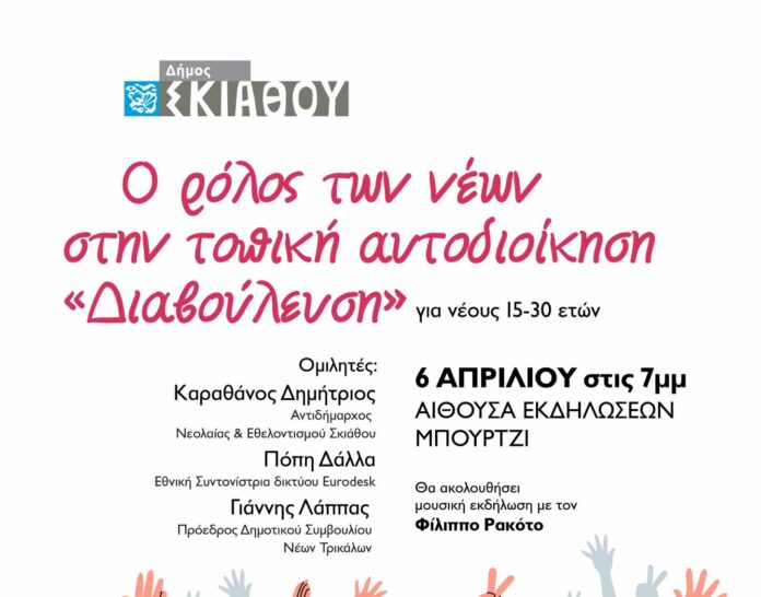 Ο Δήμος Σκιάθου και η Αντιδημαρχία Νεολαίας και Εθελοντισμού αναγνωρίζοντας την αξία της συμμετοχής των νέων στην τοπική αυτοδιοίκηση διοργανώνει ανοιχτή δημόσια διαβούλευση με θέμα «Ο ρόλος των νέων 15-30 στην τοπική αυτοδιοίκηση» το Σάββατο 6 Απριλίου 2024 στις 19:00 στην αίθουσα Δημοτικού Συμβουλίου στο Μπούρτζι.
