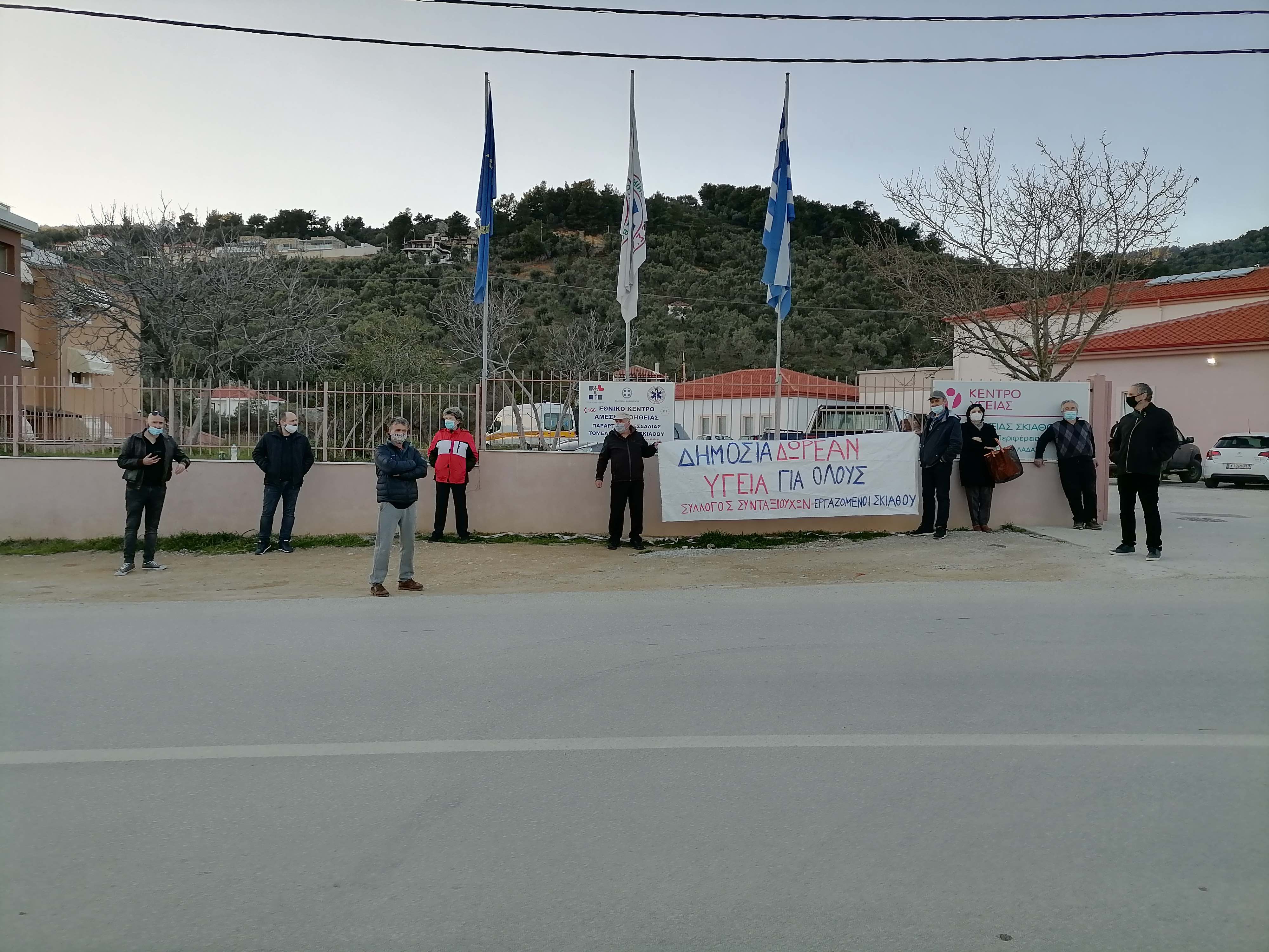 Σε παράσταση διαμαρτυρίας τηρώντας όλα τα μέτρα προστασίας πραγματοποίησαν την Τετάρτη 3 Φεβρουαρίου μέλη της Διοικούσας Επιτροπής του παραρτήματος Σκιάθου του Συλλόγου Συνταξιούχων ΙΚΑ νομού Μαγνησίας καθώς και εργαζόμενοι, διεκδικώντας την άμεση στήριξη και θωράκιση του Δημόσιου Συστήματος Υγείας.