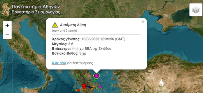 Σεισμός έντασης 3,6 Ρίχτερ σημειώθηκε δέκα λεπτά μετά τις 3.30 σήμερα το μεσημέρι 44.4 χμ ΒΒΑ της Σκιάθου, ενώ έγινε αισθητός και στον Βόλο. Το εστιακό του βάθος ήταν 3 χμ.