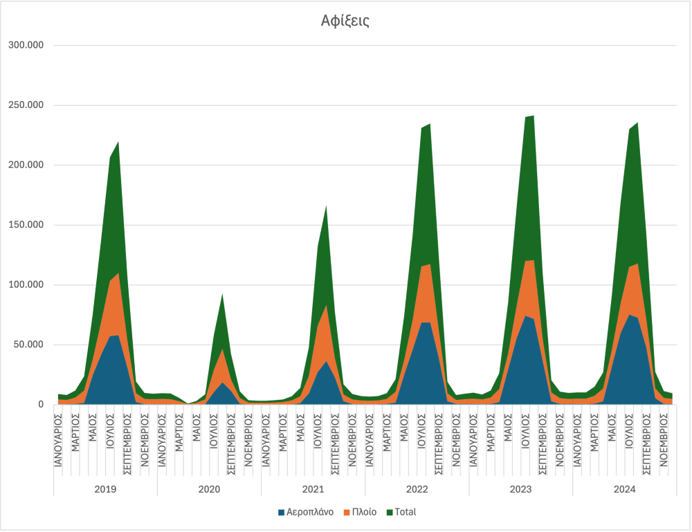 Η Σκιάθος, ακολουθώντας και αυτή σαν προορισμός, τη γενικότερη αυξητική τάση των αφίξεων στη χώρα μας, είδε μια αύξηση των αφίξεων στο έτος της τάξης του 3,9%.