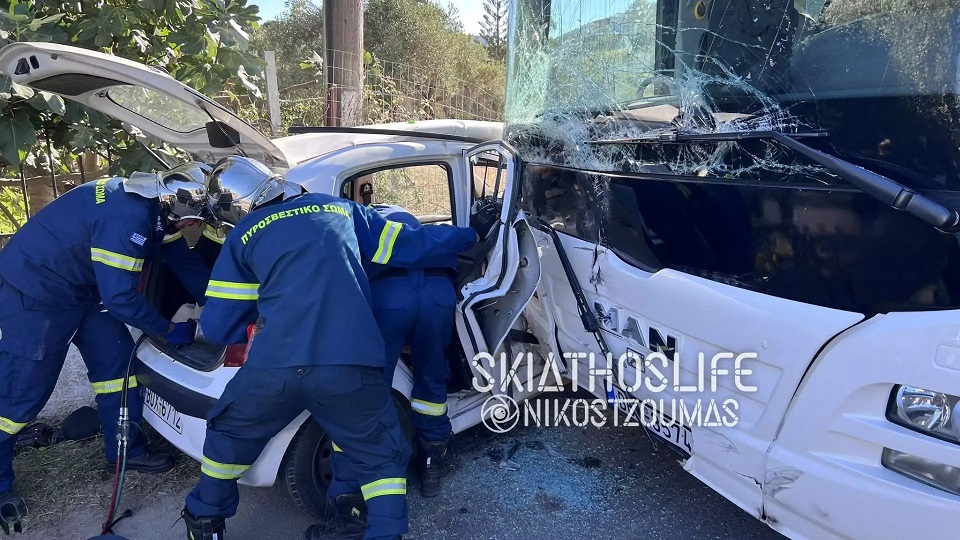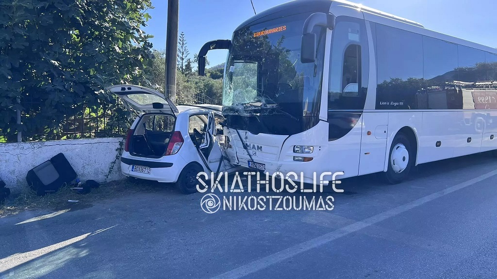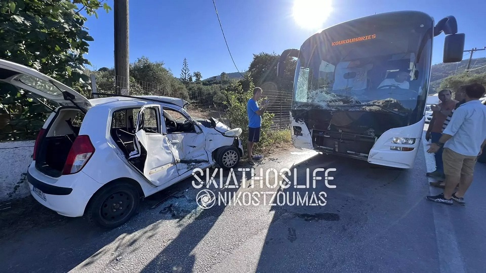 Σφοδρή πλαγιομετωπική σύγκρουση έγινε χθες στις 17:40 στην περιφερειακή οδό της Σκιάθου στο ύψος του πρώην Vicko, λεωφορείου των Συγκοινωνιών Σκιάθου με ενοικιαζόμενο αυτοκίνητο που οδηγούσε αλλοδαπός με γυναίκα συνοδηγό.