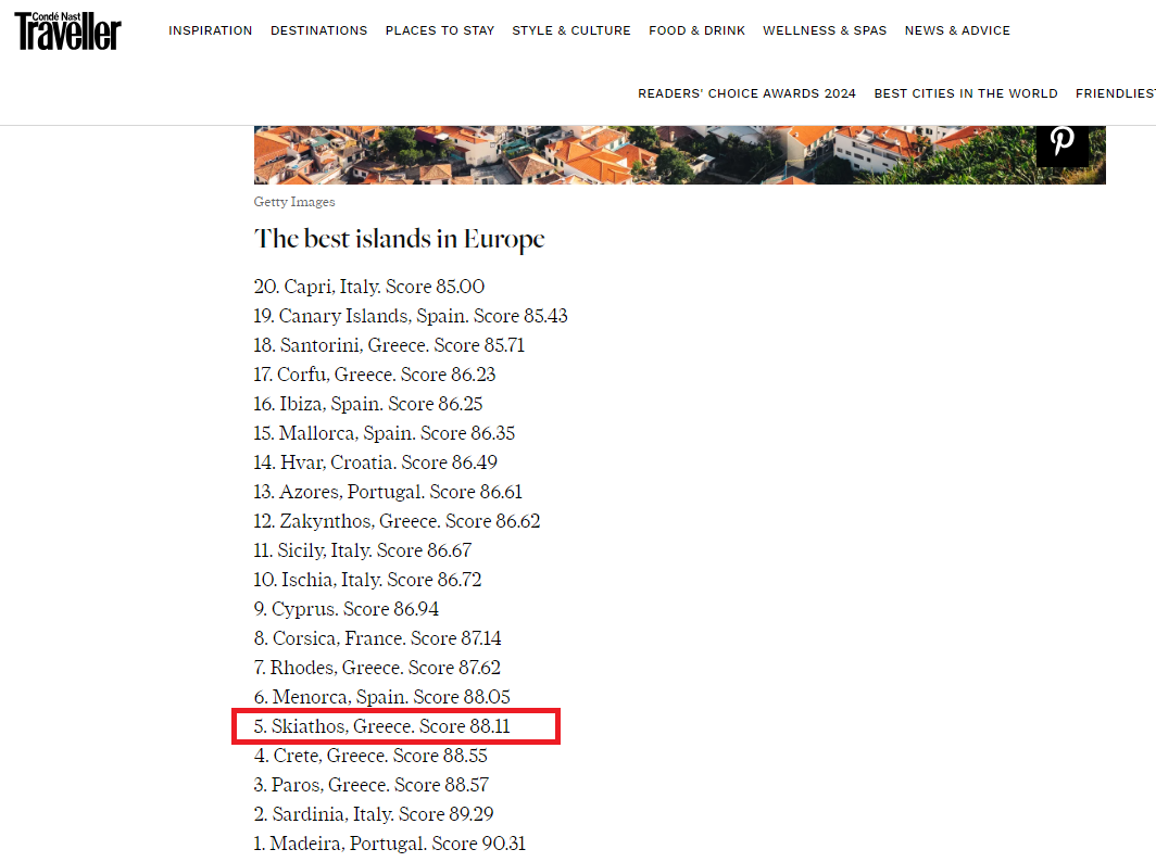Συγκεκριμένα η Σκιάθος βρίσκεται στην 5η θέση, με τα ελληνικά νησιά να έχουν την τιμητική τους, αφού 7 συμπεριλαμβάνονται στη συγκεκριμένη λίστα. Εστιάζοντας στα ελληνικά νησιά που οι αναγνώστες του περιοδικού ανέδειξαν στις προτιμήσεις τους, αυτά είναι η Πάρος (3η θέση), η Κρήτη ( 4 θέση) η η Σκιάθος (5η), η Ρόδος (7η), η Ζάκυνθος (12η), η Κέρκυρα (17η) και η Σαντορίνη στην (18η).