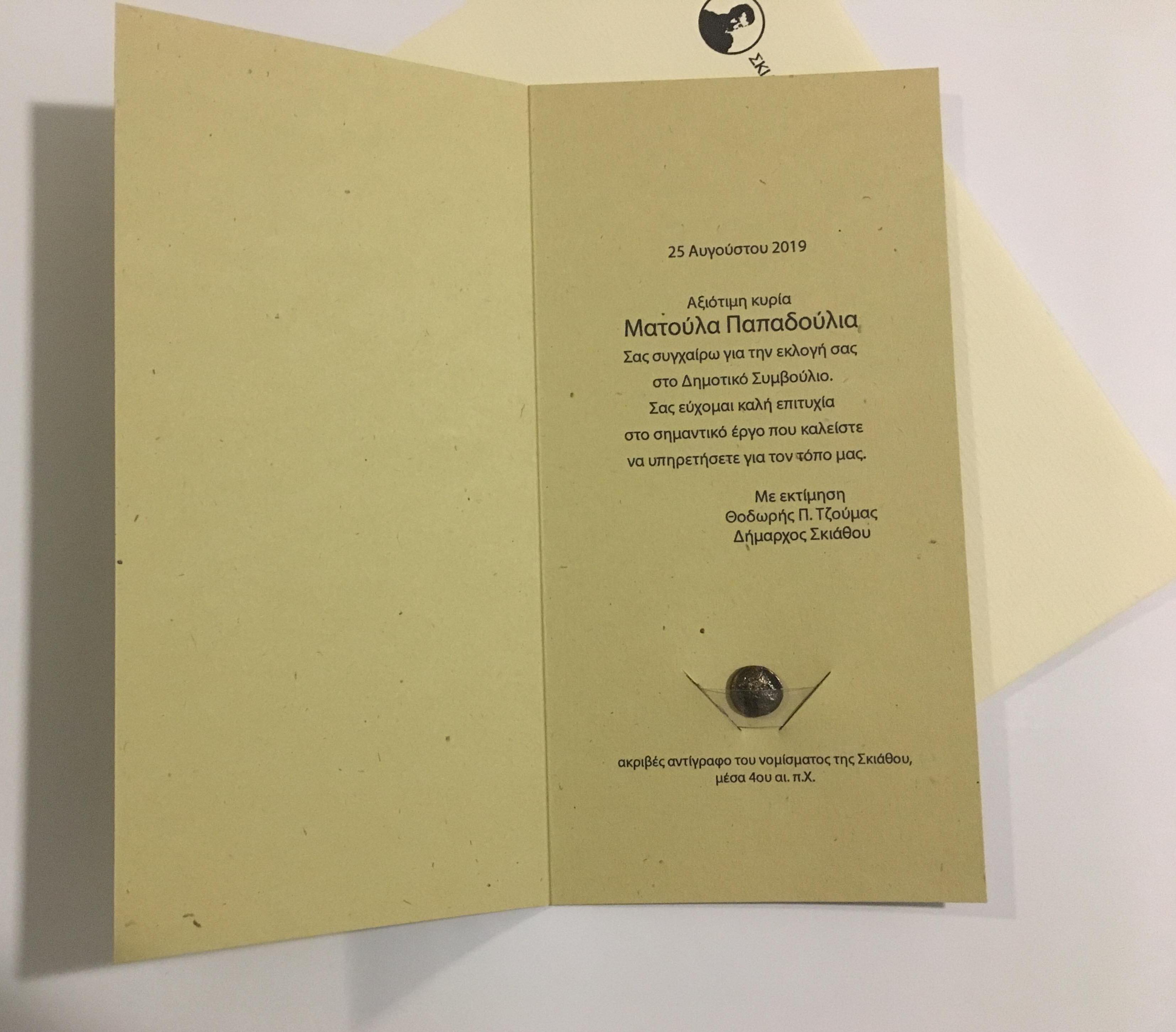 Σε ανάμνηση της μέρας ο Δήμαρχος χάρισε ως αναμνηστικό σε όλα τα μέλη του νέου Δημοτικού Συμβουλίου το ακριβές αντίγραφο του αρχαίου νομίσματος της Σκιάθου.