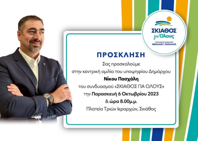 Την Παρασκευή 6 Οκτωβρίου στις 8 το βράδυ στην Πλατεία Τριών Ιεραρχών, θα πραγματοποιηθεί η κεντρική ομιλία του υποψηφίου Δημάρχου Σκιάθου με τον συνδυασμό «Σκιάθος για όλους» Νίκου Πασχάλη.
