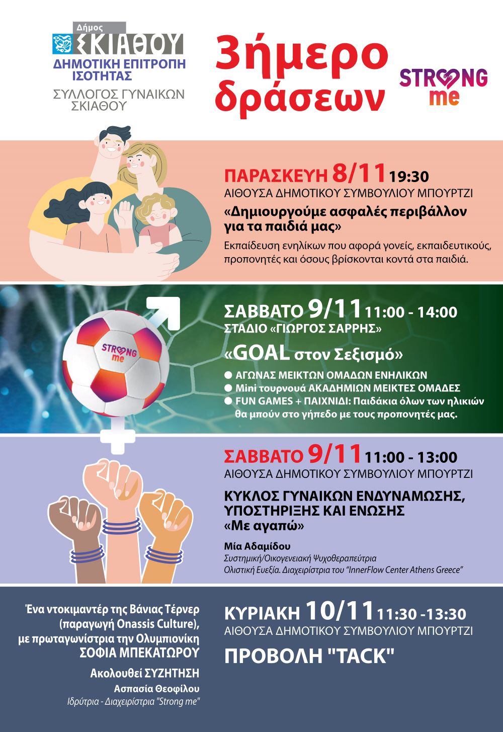 Τριήμερο δράσεων κατά της ενδοοικογενειακής και της έμφυλης βίας υλοποιεί ο Δήμος Σκιάθου από τις 8 έως και τις 10 Νοεμβρίου. Ειδικότερα σύμφωνα με το πρόγραμμα την Παρασκευή 8 Νοεμβρίου από τις 19:30 έως και 21:30 θα παρουσιαστεί η εισήγηση «ΔΗΜΙΟΥΡΓΟΥΜΕ ΑΣΦΑΛΕΣ ΠΕΡΙΒΑΛΛΟΝ ΓΙΑ ΤΑ ΠΑΙΔΙΑ ΜΑΣ» και αφορά στην εκπαίδευση ενηλίκων.