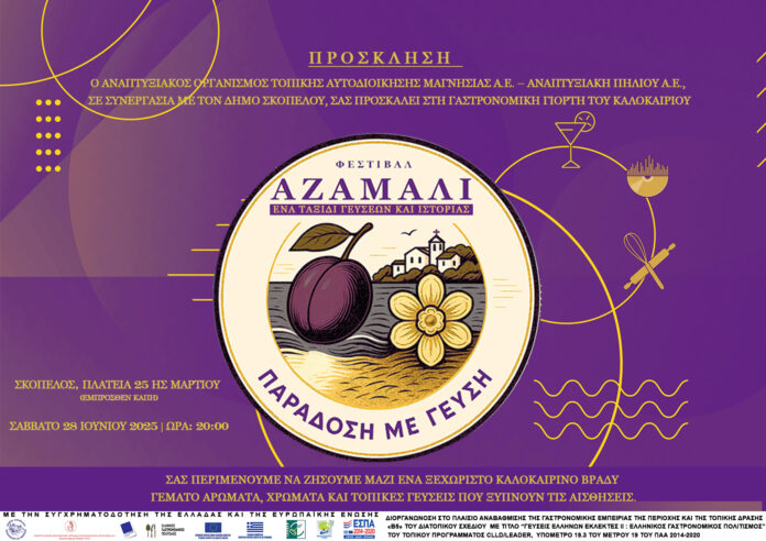 Ο Αναπτυξιακός Οργανισμός Τοπικής Αυτοδιοίκησης Μαγνησίας Α.Ε. – Αναπτυξιακή Πηλίου Α.Ε., σε συνεργασία με τον Δήμο Σκοπέλου, διοργανώνουν τη γαστρονομική γιορτή του καλοκαιριού με τίτλο « ΑΖΑΜΑΛΙ (Αζάν και Χαμαλί)»- Φεστιβάλ Γαστρονομίας & Τοπικής Παράδοσης. Η εκδήλωση θα πραγματοποιηθεί στη Σκόπελο, στην Πλατεία 25ης Μαρτίου (έμπροσθεν ΚΑΠΗ) το Σάββατο 28 Ιουνίου στις 20:00.