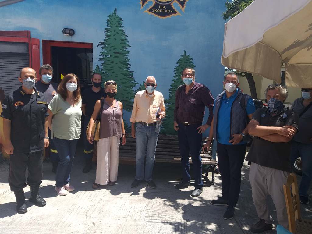 Όπως αναφέρεται σε ανακοίνωση του Γραφείοε Τύπου της ΝΕ, «αρχικά, πραγματοποιήθηκε συνάντηση με τον Δήμαρχο Σκοπέλου Σταμάτη Περίσση, τον πρόεδρο του Δημοτικού Συμβουλίου Άγγελο Ξηντάρη και τον Αντιδήμαρχο Αριστείδη Βούλγαρη, και στη συνέχεια επισκέψεις στο Κέντρο Υγείας, στην Πυροσβεστική και στη Δημοτική Επιχείρηση Ύδρευσης και Αποχέτευσης Σκοπέλου.