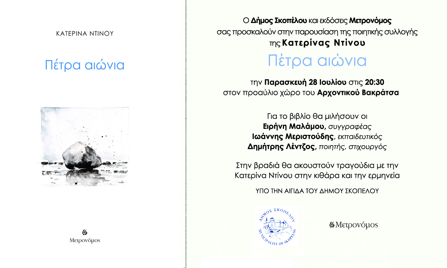 Ο Δήμος Σκοπέλου και οι εκδόσεις Μετρονόμος διοργανώνουν την παρουσίαση της ποιητικής συλλογής της Κατερίνας Ντίνου «Πέτρα αιώνια» την Παρασκευή 28 Ιουλίου στις 20:30 στον προαύλιο χώρο του Αρχοντικού Βακράτσα.
