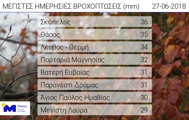 Κατά τις πρώτες ώρες της Τετάρτης 27/06 η «Νεφέλη» έπληξε με βροχές και καταιγίδες τόσο ηπειρωτικές, όσο και νησιωτικές περιοχές της χώρας, όπου στη Σκόπελο έχει πέσει η μεγαλύτερη ποσότητα βροχής, καθώς και στην Πορταριά. Όπως φαίνεται από τον πίνακα όπου παρουσιάζονται τα μεγαλύτερα ύψη ολικού υετούς έως τις 09:00 τοπική ώρα, τα ισχυρότερα φαινόμενα σημειώθηκαν στο Βόρειο Αιγαίο, την Εύβοια, και τα βόρεια ηπειρωτικά.