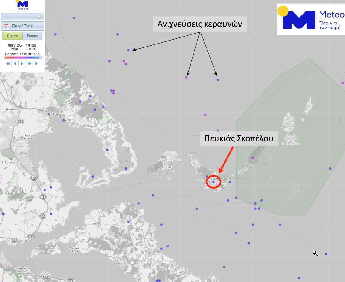 Το σύστημα ανίχνευσης κεραυνών «ZEUS» του Εθνικού Αστεροσκοπείου Αθηνών/meteo.gr κατέγραψε το κεραυνικό πλήγμα, το οποίο σήμερα το πρωί χτύπησε μία 52χρονη γυναίκα στον Πευκιά Σκοπέλου, την ώρα που εκτελούσε αγροτικές εργασίες και η οποία βρήκε ακαριαίο θάνατο.