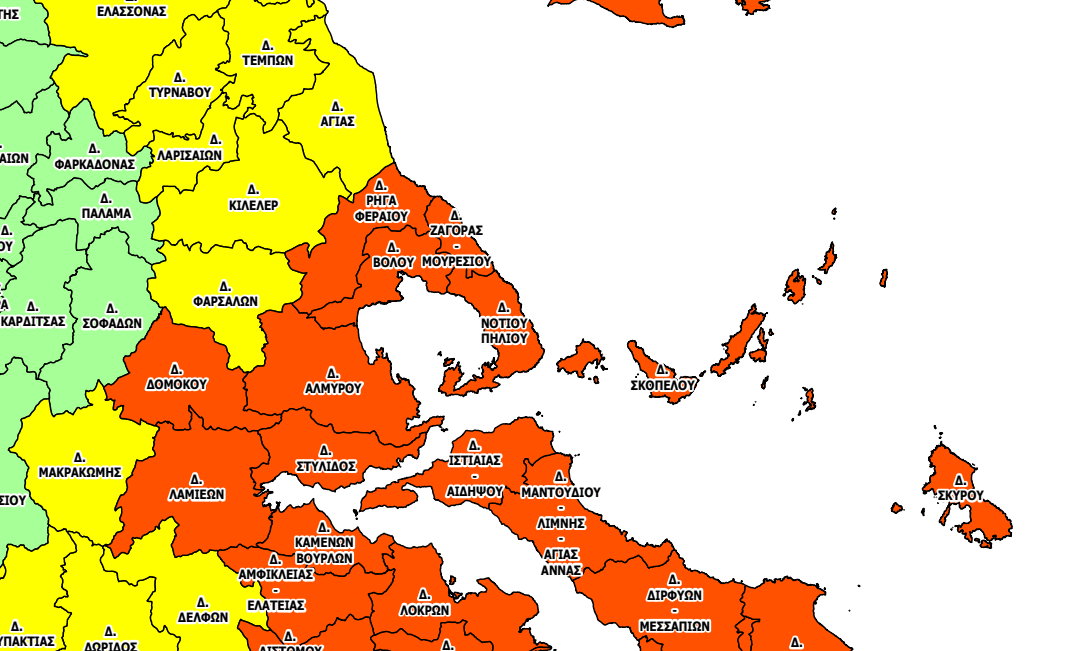 Στον χάρτη διαφαίνεται η Μαγνησία να βρίσκεται στο «κόκκινο». Αυτό σημαίνει ότι όλοι οι Δήμοι της χερσαίας Μαγνησίας αλλά και τα νησιά των Β. Σποράδων κατατάσσονται στην υψηλή επικινδυνότητα για εκδήλωση πυρκαγιάς, με τον νομό να είναι ο μοναδικός θεσσαλικός που βρίσκεται σε άμεσο κίνδυνο.
