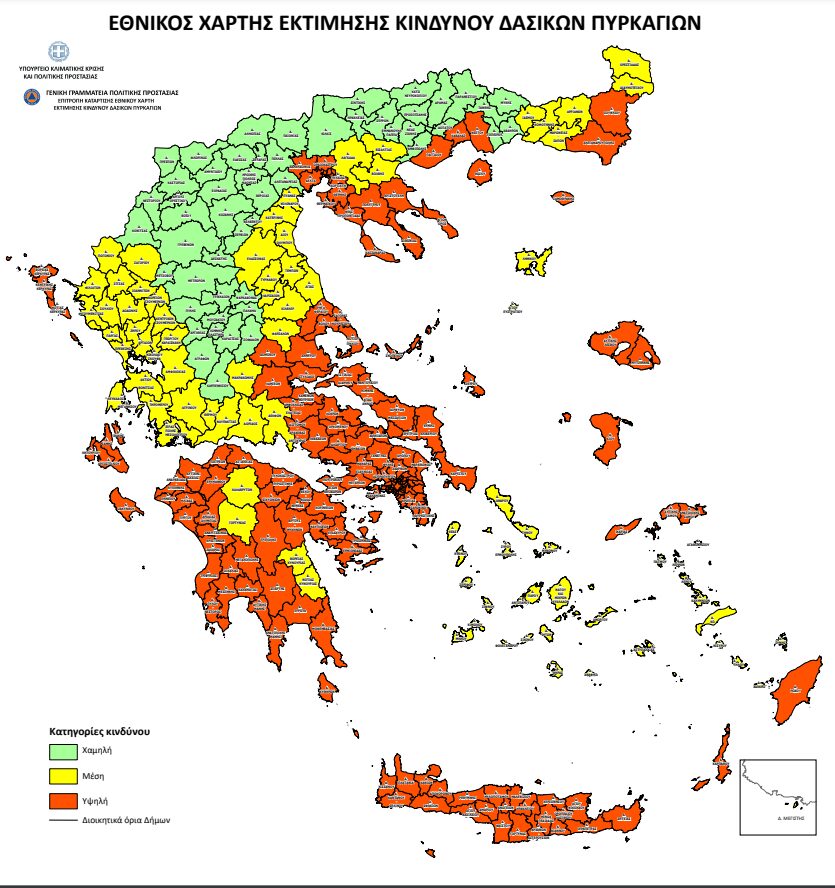 Σήμερα, έχοντας μεσολαβήσει 45 χρόνια από τον αρχικό προσδιορισμό των ελληνικών περιοχών, βάσει του κινδύνου δασικής πυρκαγιάς που αντιμετωπίζουν, οι συνθήκες έχουν αλλάξει άρδην. Με τον νέο Χάρτη, οι Δήμοι της χώρας κατατάσσονται σε 3 κατηγορίες: χαμηλής, μεσαίας και υψηλής επικινδυνότητας, ανάλογα με το είδος της βλάστησης, τις κλιματολογικές συνθήκες και τη συχνότητα τιμών 3, 4 και 5 στον ημερήσιο Χάρτη Πρόβλεψης Κινδύνου Πυρκαγιάς της Γενικής Γραμματείας Πολιτικής Προστασίας τα τελευταία 20 έτη.