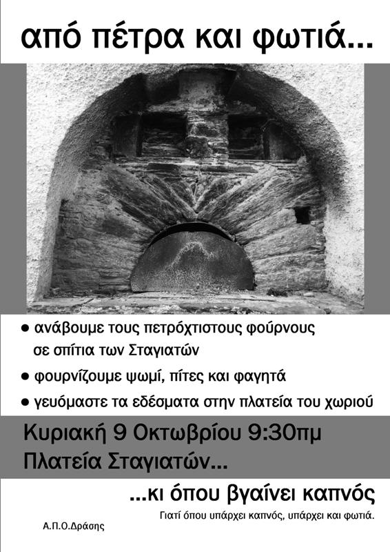 «Την Κυριακή 9 Οκτώβρη ζωντανεύουμε ένα σημαντικό μέρος της καθημερινότητας του μικρού χωριού μας. Επαναφέρουμε στη ζωή μας όχι συμβολικά αλλά ουσιαστικά τους φούρνους οκτώ σπιτιών, ως πρώτη δόση, εφτά από τους οποίους λειτούργησαν για τελευταία φορά πριν από 30 ως 70 χρόνια. Στο πλαίσιο της αυτονομίας και της αυτοδιαχείρισης της ζωής μας και σε συνδυασμό με άλλες σχετικές πρακτικές μας, όπως της διατήρησης των παραδοσιακών σπόρων και της βιολογικής καλλιέργειας κήπων- μπαξέδων.