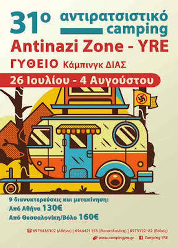 To 31o κάμπινγκ Antinazi Zone – YRE θα πραγματοποιηθεί από Παρασκευή 26 Ιουλίου έως Κυριακή 4 Αυγούστου στο Γύθειο (περιοχή Βαθύ) σε μια πανέμορφη παραλία στο οργανωμένο κάμπινγκ Δίας (www.campingdias.gr)