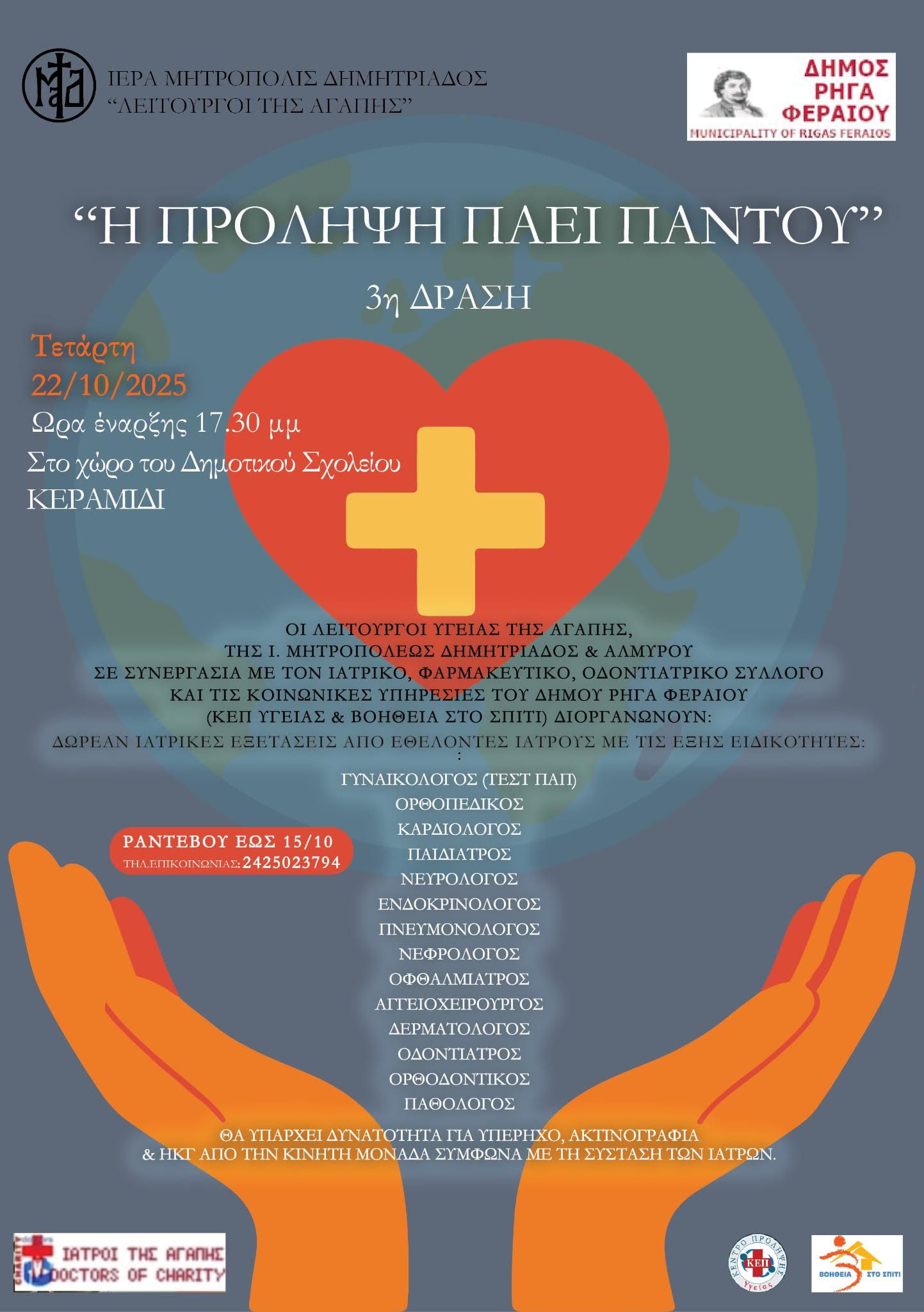 Η δράση θα πραγματοποιηθεί στο σχολείο της Τοπικής Κοινότητας Κεραμιδίου στις 5.30 το απόγευμα, με τη συμμετοχή του ΚΕΠ υγείας και των κοινωνικών δομών του Δήμου Ρήγα Φεραίου, σε συνεργασία με τους Λειτουργούς της Αγάπης της Ιεράς Μητρόπολης Δημητριάδος και Αλμυρού, αλλά και τον Ιατρικό, Φαρμακευτικό και Οδοντιατρικό Σύλλογο Μαγνησίας.
