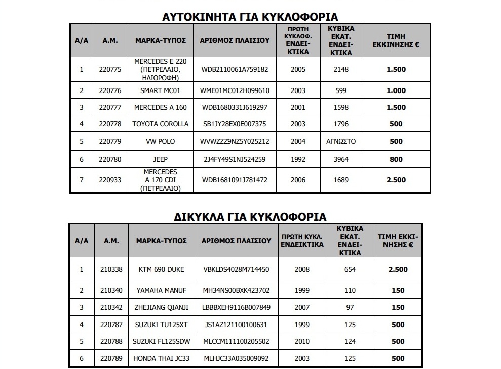 Με τιμές εκκίνησης από 500 ευρώ για αυτοκίνητα και 150 ευρώ για δίκυκλα !