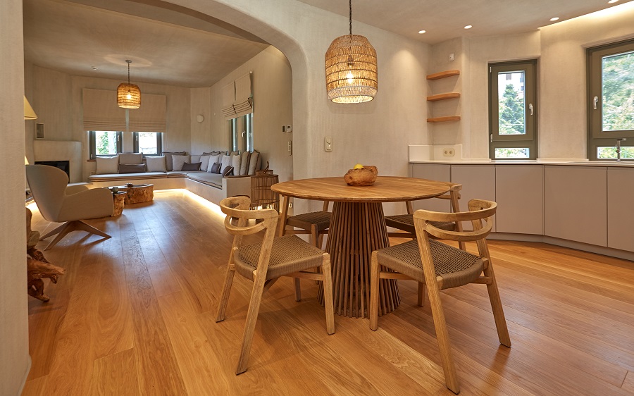 Η εσωτερική διαμόρφωση των διαμερισμάτων ακολουθεί μια οργανική μορφή με οβάλ φόρμες επίπλων και χειροποίητων ξύλινων στοιχείων.