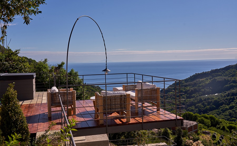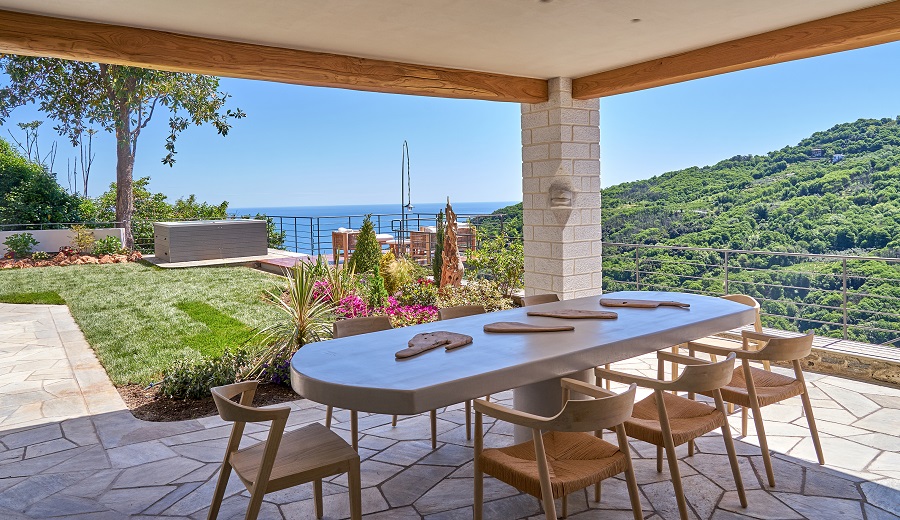 Πινελιά της εξωτερικής διαμόρφωσης αποτελεί το «μπαλκόνι» που ξεπροβάλλει δυναμικά από την υψηλότερη στάθμη των κρεμαστών κήπων. Δημιουργείται ένας φιλόξενος εξωτερικός χώρος σε συνέχεια με την αυλή, κατάλληλος για να απολαύσει κανείς τη θέα προς το Αιγαίο Πέλαγος.