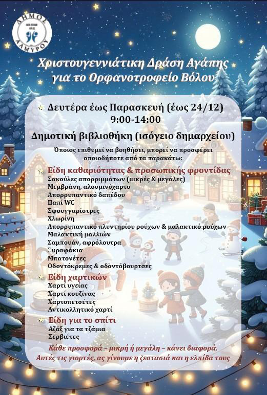 Δράση κοινωνικής προσφοράς για τη συγκέντρωση ειδών για το Ορφανοτροφείο του Βόλου πραγματοποιεί το Δημοτικό Συμβούλιο Νέων του Δήμου Αλμυρού «Νέα Γενιά». Η συγκέντρωση των ειδών θα γίνεται από Δευτέρα έως και Παρασκευή από τις 9 έως και τις 2 το μεσημέρι στη Δημοτική Βιβλιοθήκη Αλμυρού έως και τις 24 Δεκεμβρίου.