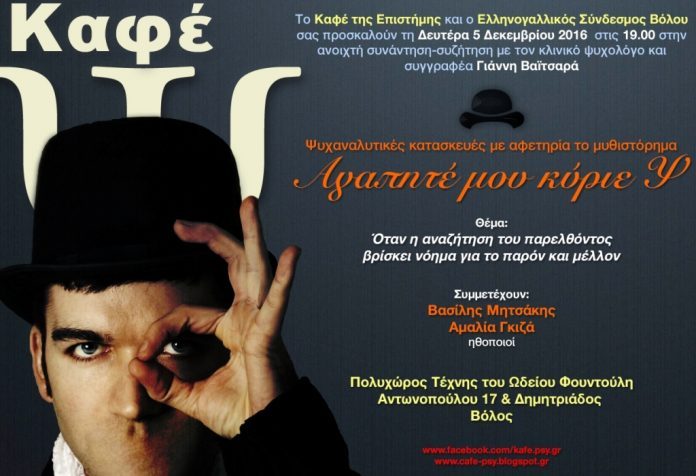 Το ”Καφέ της Επιστήμης και των Τεχνών” και ο Ελληνογαλλικός Σύνδεσμος Bόλου διοργανώνουν τη Δευτέρα 5 Δεκεμβρίου 2016 στην ανοιχτή συνάντηση – συζήτηση με τον κλινικό ψυχολόγο και συγγραφέα Γιάννη Βαïτσαρά «Καφέ ”Ψ” , Ψυχαναλυτικές κατασκευές, με αφετηρία το μυθιστόρημα Αγαπητέ μου κύριε Ψ. Όταν η αναζήτηση του παρελθόντος βρίσκει νόημα για το παρόν και το μέλλον».
