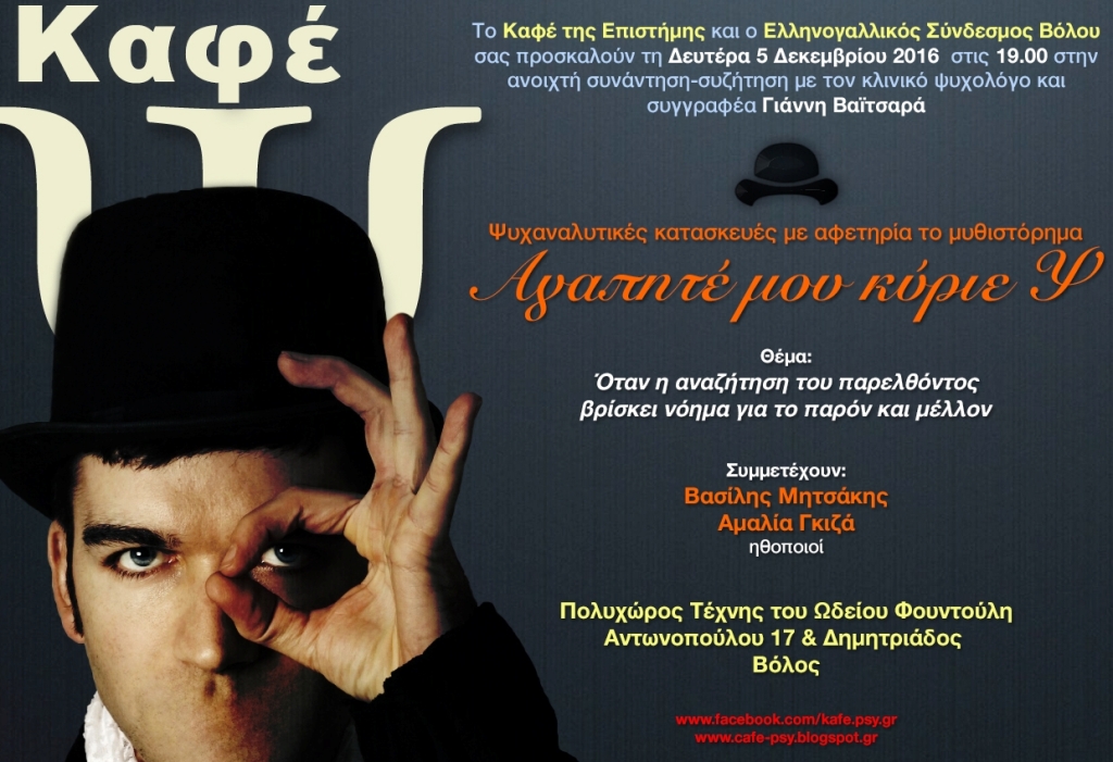 Το ”Καφέ της Επιστήμης και των Τεχνών” και ο Ελληνογαλλικός Σύνδεσμος Bόλου διοργανώνουν σήμερα Δευτέρα 5 Δεκεμβρίου 2016 στην ανοιχτή συνάντηση – συζήτηση με τον κλινικό ψυχολόγο και συγγραφέα Γιάννη Βαïτσαρά «Καφέ ”Ψ” , Ψυχαναλυτικές κατασκευές, με αφετηρία το μυθιστόρημα Αγαπητέ μου κύριε Ψ. Όταν η αναζήτηση του παρελθόντος βρίσκει νόημα για το παρόν και το μέλλον».