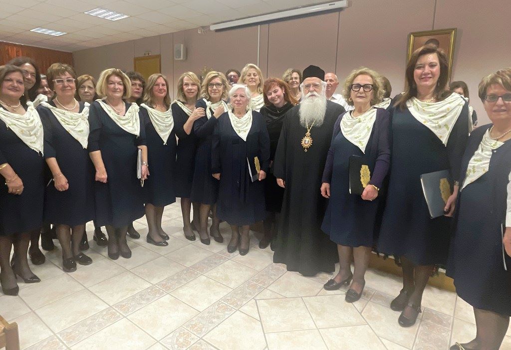 Στο τέλος της ομιλίας, η χορωδία της Ιεράς Μητρόπολης απέδωσε χριστουγεννιάτικα τραγούδια, υπό τη διεύθυνση της κ. Μαριάννας Σαμαρτζή.