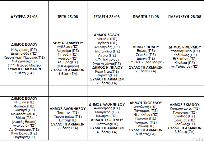 Η εφαρμογή του προγράμματος καταπολέμησης κουνουπιών με τη μέθοδο της προνυμφοκτονίας για το χρονικό διάστημα από 24/8/2020 έως 28/8/2020 (επικαιροποίηση χαρτογράφησης, δειγματοληψίες, ψεκασμοί περιαστικού και φυσικού συστήματος), θα πραγματοποιηθεί την προσεχή Δευτέρα 24-8-2020 στο Δήμο Βόλου, την Τρίτη 25-8-2020 στους Δήμους Αλμυρού και Αλοννήσου, την Τετάρτη 26-8-2020 στους Δήμους Βόλου, Νοτίου Πηλίου, Αλοννήσου και Σκοπέλου, την Πέμπτη 27-8-2020 στους Δήμους Βόλου και Σκοπέλου και την Παρασκευή 28-8-2020 θα πραγματοποιηθεί στους Δήμους Ρήγα Φεραίου και Σκιάθου.