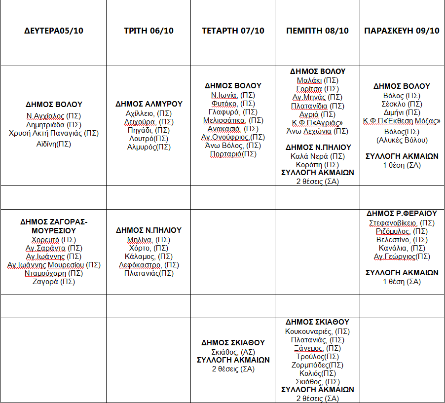 Η εφαρμογή του προγράμματος καταπολέμησης κουνουπιών με τη μέθοδο της προνυμφοκτονίας για το χρονικό διάστημα από 5/10/2020 έως 9/10/2020 (επικαιροποίηση χαρτογράφησης, δειγματοληψίες, ψεκασμοί περιαστικού και φυσικού συστήματος), θα πραγματοποιηθεί την προσεχή Δευτέρα 5-10-2020 στους Δήμους Βόλου και Ζαγοράς, την Τρίτη 6-10-2020 στους Δήμους Αλμυρού και Ν. Πηλίου, την Τετάρτη 7-10-2020 στους Δήμους Βόλου και Σκιάθου, την Πέμπτη 8-10-2020 στους Δήμους Βόλου, Ν. Πηλίου και Σκιάθου και την Παρασκευή 9-10-2020 θα πραγματοποιηθεί στους Δήμους Βόλου και Ρ. Φεραίου.