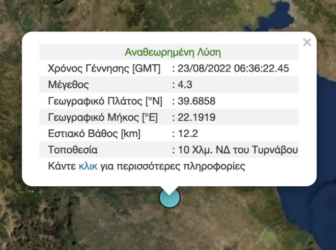 Σεισμός με επίκεντρο 10 χιλιόμετρα νοτιοδυτικά του Τυρνάβου, σημειώθηκε στις 09:36 το πρωί, με το μέγεθος του Εγκέλαδου να φτάνει τα 4,3 Ρίχτερ. Σύμφωνα με την πρώτη μέτρηση του Γεωδυναμικού Ινστιτούτου, το εστιακό βάθος ήταν στα 12 χιλιόμετρα. Με τη σεισμική δόνηση να γίνεται ιδιαίτερα αισθητή σε Θεσσαλία και Μαγνησία, χωρίς ευτυχώς μέχρι στιγμής να έχουν αναφερθεί προβλήματα, ζημιές και τραυματισμοί.