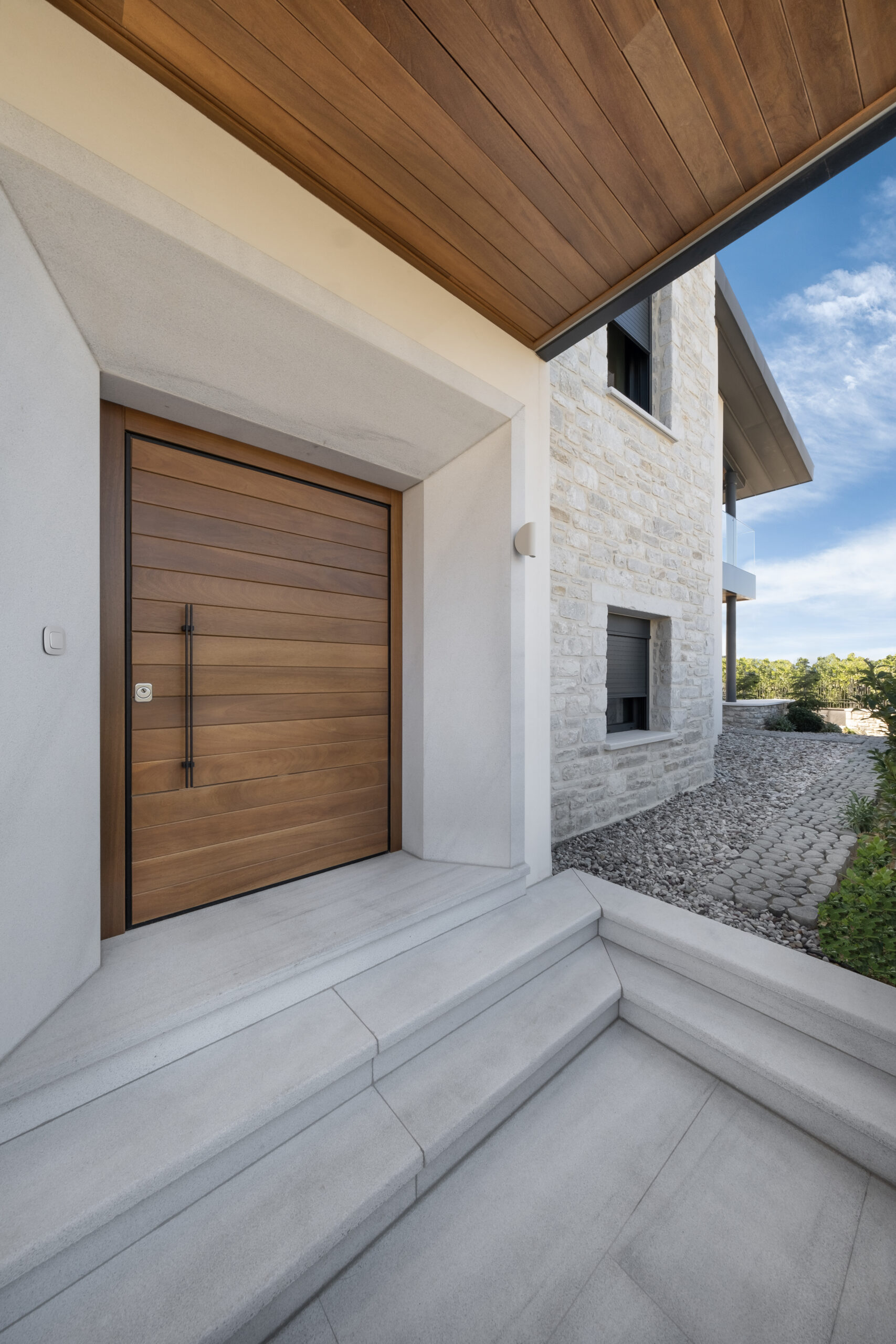 Η υλικότητα συντελεί καθοριστικά στην εξασφάλιση της ισορροπίας της τελικής εικόνας. Η επιλογή της εμφανούς λιθοδομής, των λευκών επιφανειών και των μεταλλικών στοιχείων, προσδίδει βάθος στην προοπτική με τη σύμπλευση των υλικών.