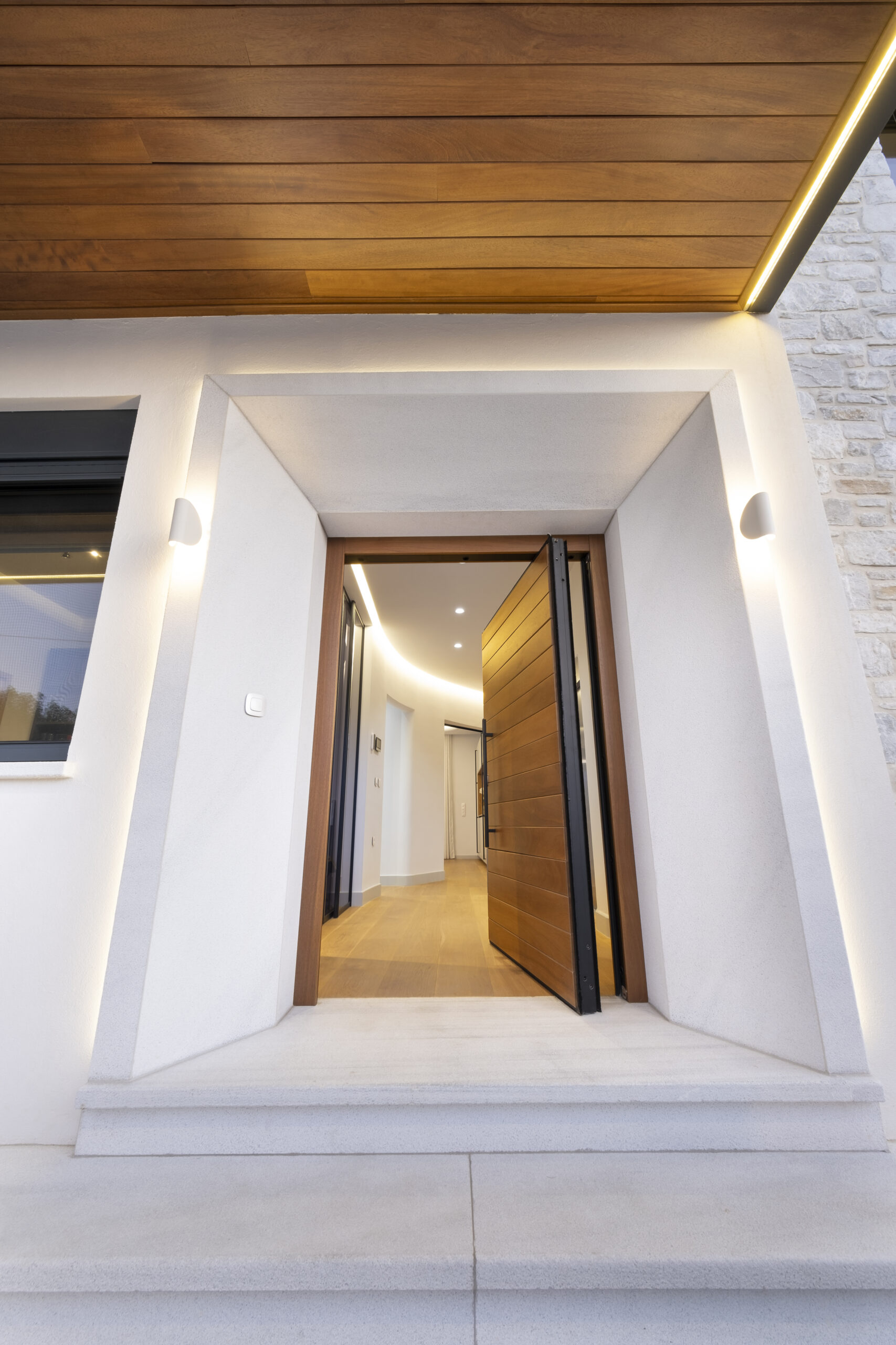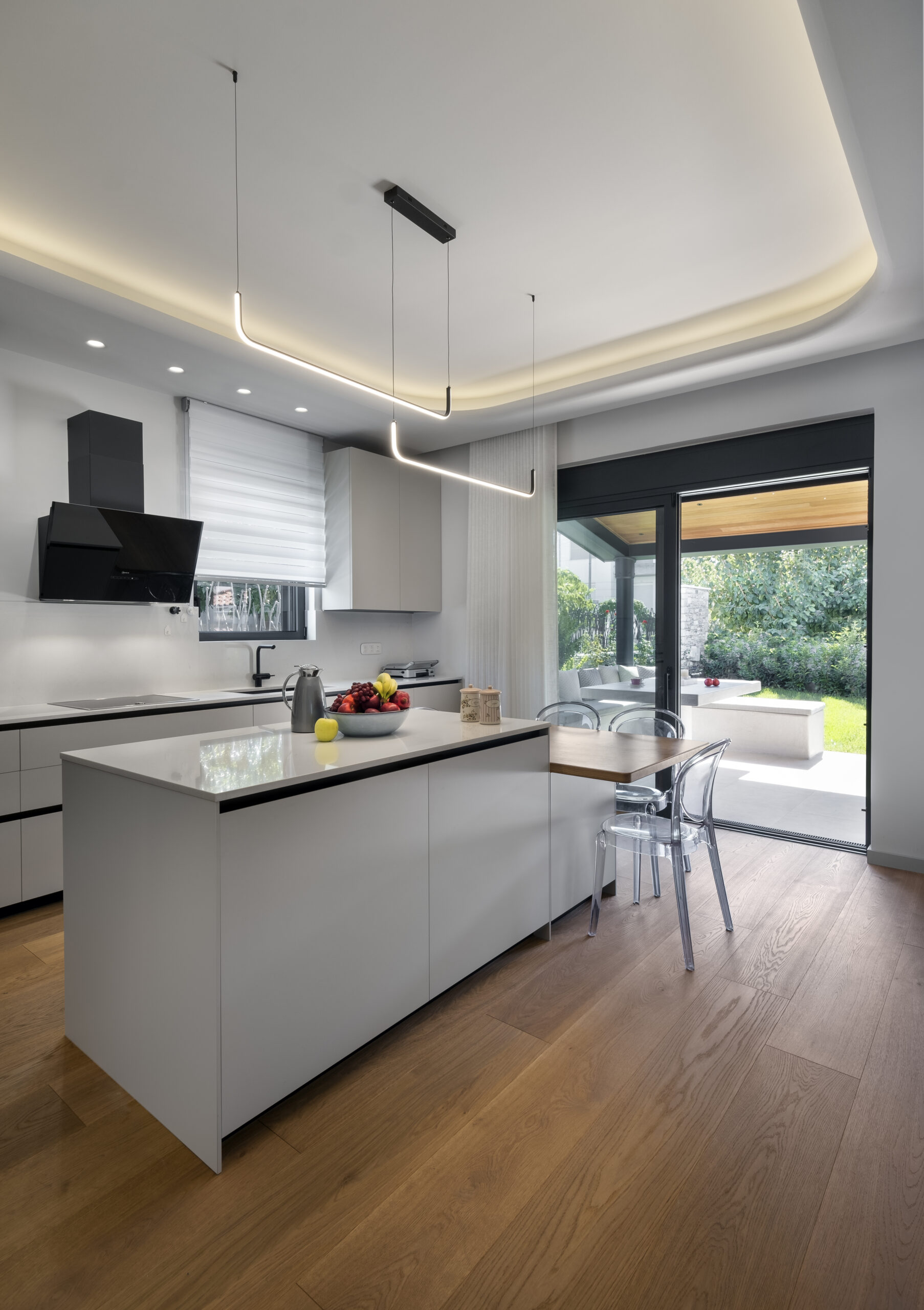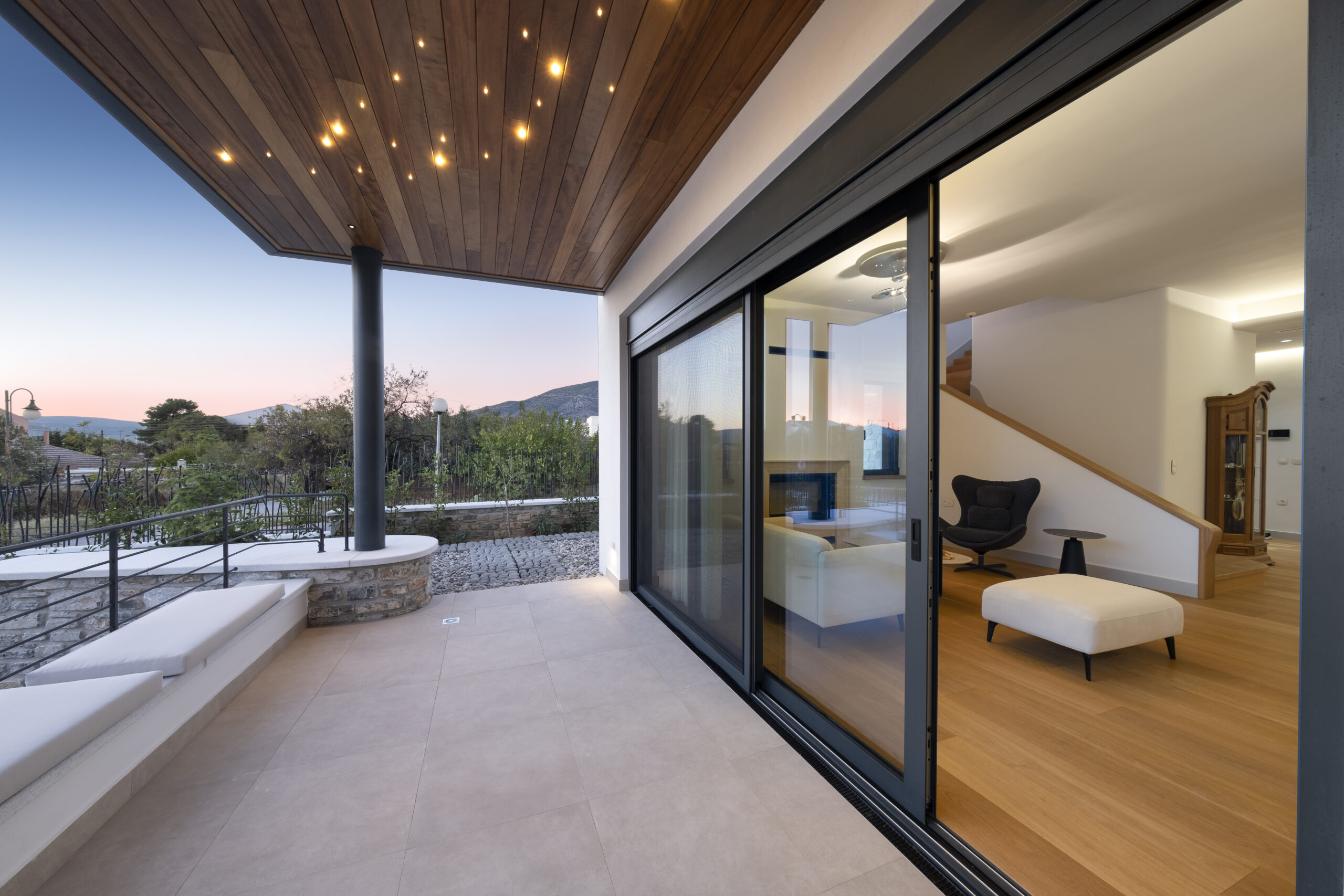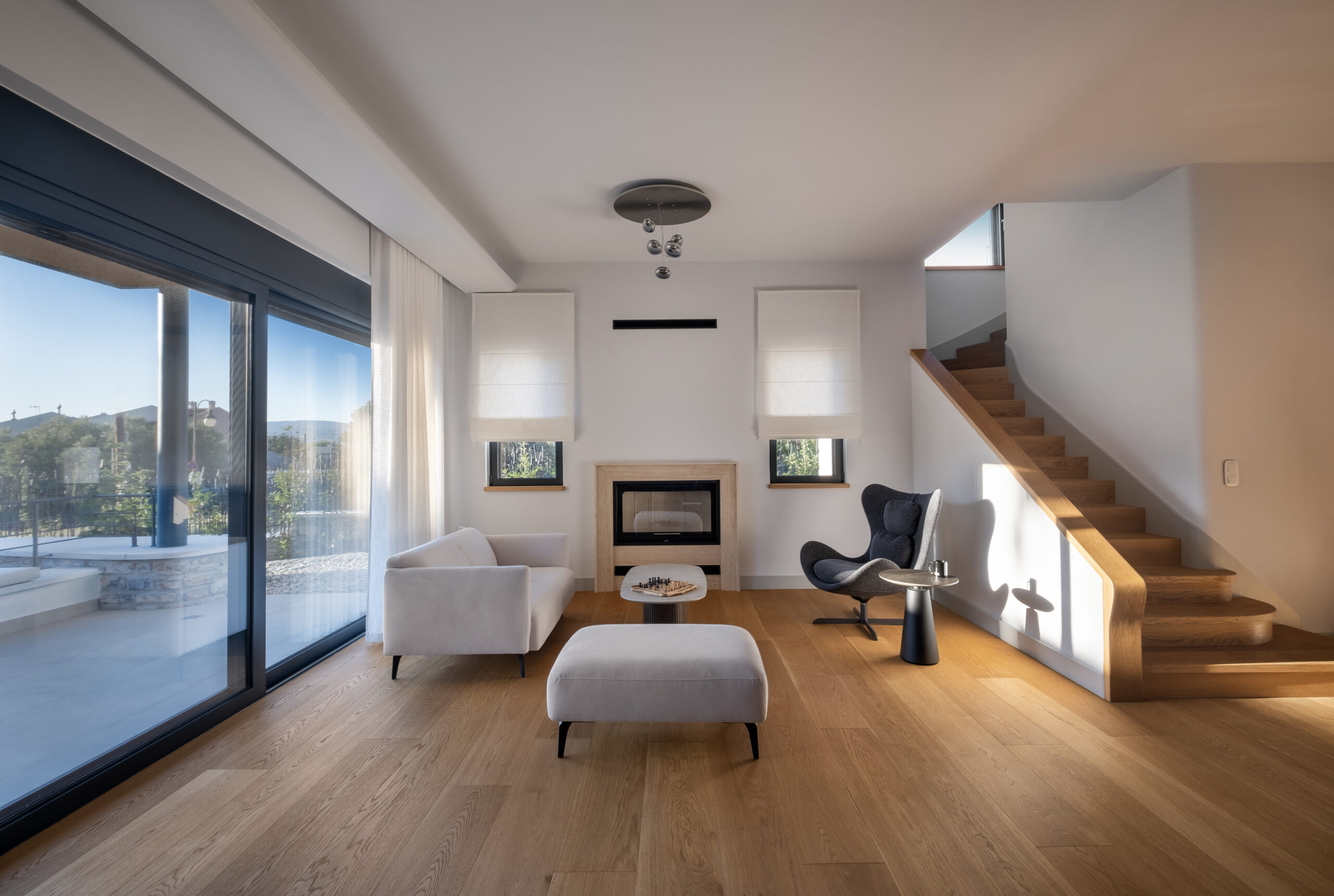 Τα μεγάλα υαλοστάσια επιτρέπουν στο φυσικό φως να διαπερνά το χώρο και ενισχύουν τη σχέση ανάμεσα στο εσωτερικό και το εξωτερικό. Η διαμπερής κάτοψη εξασφαλίζει οπτική και λειτουργική συνέχεια, προεκτείνοντας τη ζωή των κατοίκων προς τον κήπο.
