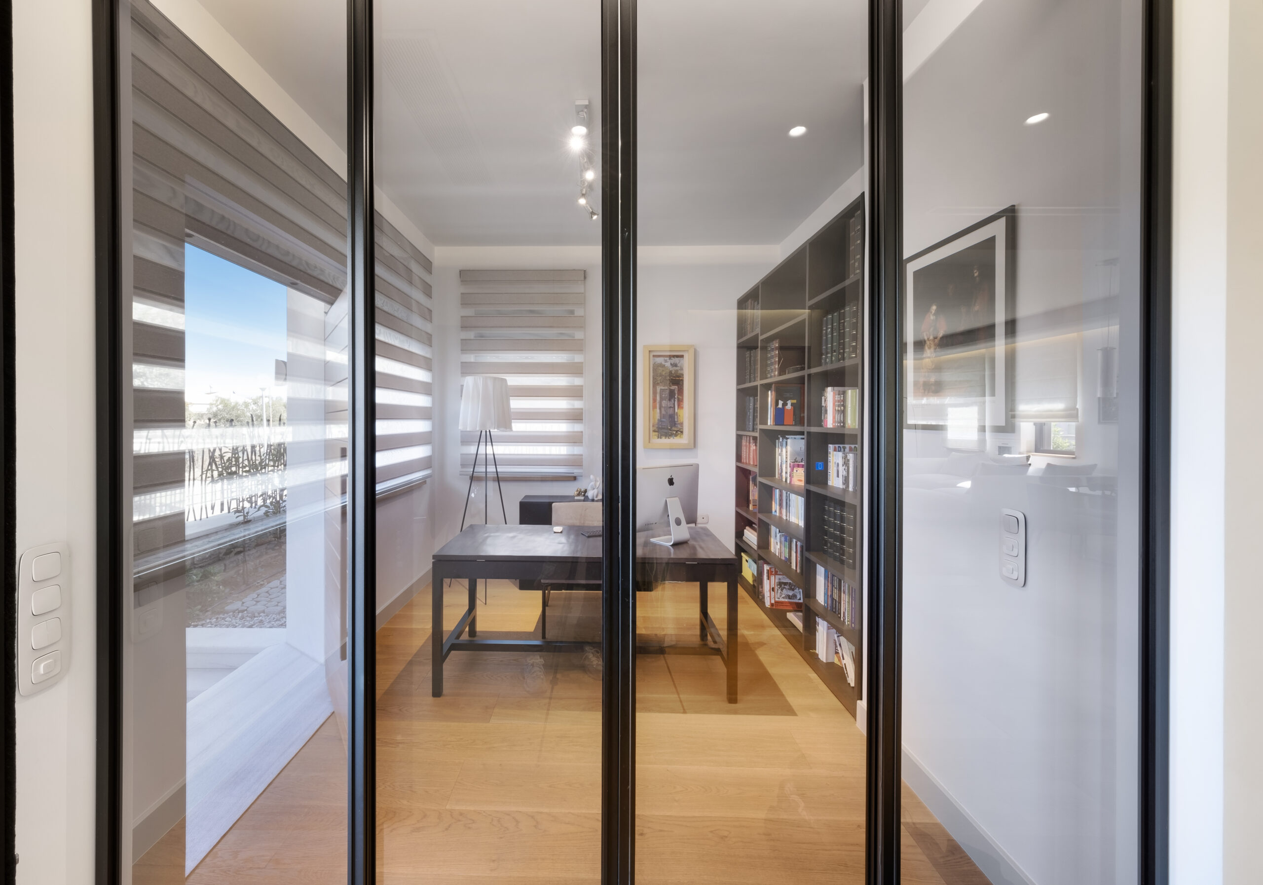 Η πρόσβαση επιτυγχάνεται τόσο εσωτερικά μέσω κλιμακοστασίου και ανελκυστήρα, όσο και εξωτερικά μέσω ράμπας. Στο ισόγειο, όπου βρίσκεται η κύρια είσοδος της κατοικίας, συναντάμε τους βασικούς κοινόχρηστους χώρους: καθιστικό, κουζίνα, WC και γραφείο, το οποίο μπορεί να λειτουργήσει ανεξάρτητα από την υπόλοιπη κατοικία. Στον όροφο στεγάζονται οι ιδιωτικές λειτουργίες της κατοικίας: καθιστικό, δύο υπνοδωμάτια με κοινό λουτρό και ένα master υπνοδωμάτιο με ανεξάρτητο λουτρό και walk-in closet.