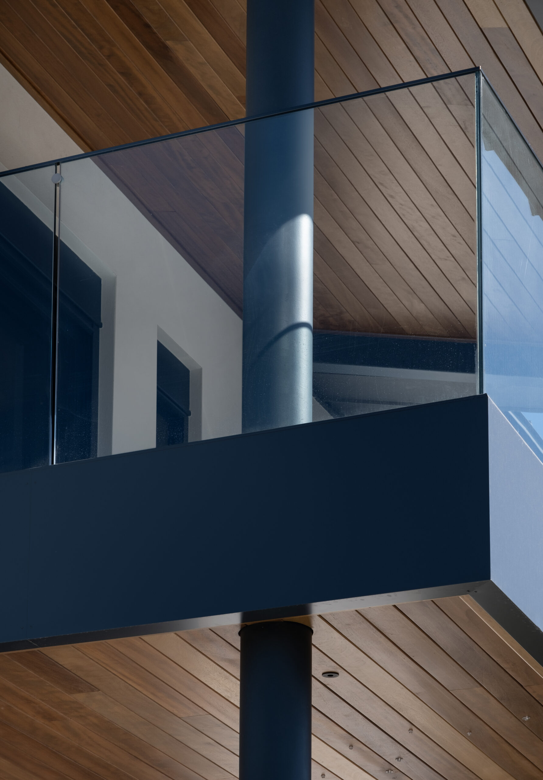 Παράλληλα, επικλινείς στέγες «αγκαλιάζουν» το οικοδόμημα συμβάλλοντας στην ενοποίηση της μορφής και δημιουργώντας ένα δυναμικό περίγραμμα.