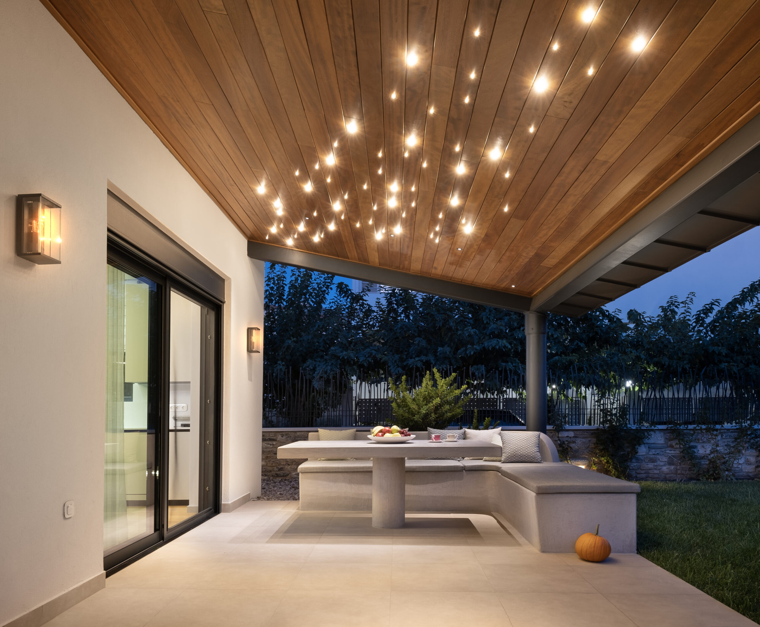 Στον εξωτερικό χώρο της κουζίνας διαμορφώνεται ημιυπαίθριος χώρος – φίλτρο μετάβασης- με καθιστικό και μεταλλικό στέγαστρο που προσφέρει σκίαση και τις απαιτούμενες συνθήκης υπαίθριας διαβίωσης.