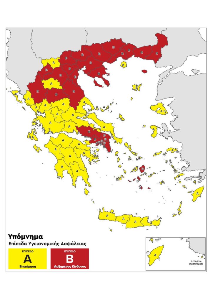 Στο επίπεδο Β – αυξημένου κινδύνου κατατάσσονται οι υπόλοιπες 27 περιφερειακές ενότητες: όλες οι περιφερειακές ενότητες της Αττικής και ο Πειραιάς, πλην των νήσων, Βοιωτία, Δράμα, Έβρος, Ημαθία, Θεσσαλονίκη, Θήρα, Ιωάννινα, Καβάλα, Καστοριά, Κιλκίς, Κοζάνη, Λάρισα, Νάξος (πλην Αμοργού), Ξάνθη, Πέλλα, Πιερία, Ροδόπη, Σέρρες, Τρίκαλα, Χαλκιδική.