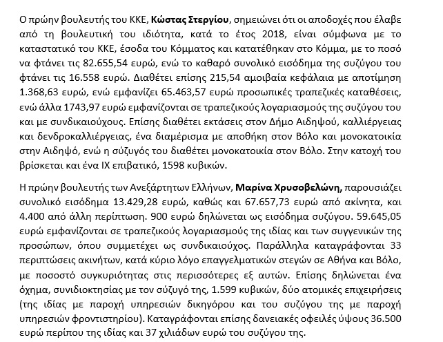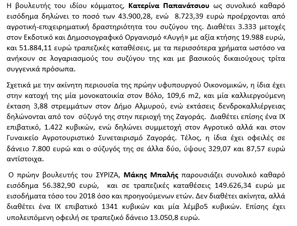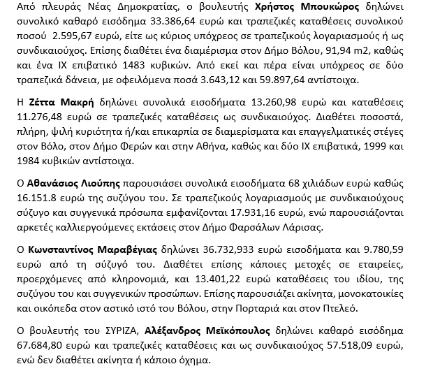 Εισοδήματα, καταθέσεις, διαμερίσματα και αγροτεμάχια διαθέτουν οι βουλευτές του Νομού Μαγνησίας, όπως φαίνεται από τις δηλώσεις περιουσιακής κατάστασης που δόθηκαν σήμερα στη δημοσιότητα, ενώ αναλυτικά δίνονται και οι τραπεζικές καταθέσεις, τόσο των ίδιων όσο και συζύγων και συνδικαιούχων.