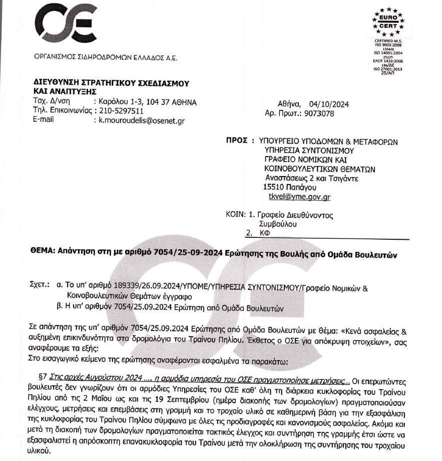 Οι βουλευτές ανέφεραν ότι: «Στις 23 Αυγούστου 2024 και ενώ τα δρομολόγια του Τρένου του Πηλίου πραγματοποιούνταν καθημερινά από τις 2 Μαΐου 2024 μεταφέροντας πλήθος κόσμου, με το υπ. αριθμ. 68503/23.08.2024 υπηρεσιακό έγγραφο, η Υπηρεσία Συντήρησης Γραμμής – Τμήμα Γραμμής ΟΣΕ Βόλου ενημέρωσε τον Διευθύνοντα Σύμβουλο του ΟΣΕ για συγκεκριμένα προβλήματα και φθορές στη σιδηροδρομική γραμμή του Τρένου. Η συγκεκριμένη ενημέρωση δεν κοινοποιείται στην HellenicTrain ως πάροχο της σιδηροδρομικής μεταφοράς. Στις 10 Σεπτεμβρίου 2024 και ενώ το Τρένο του Πηλίου συνέχιζε την καθημερινή του λειτουργία, διαπιστώθηκε φθορά στους τροχούς κύλισης των δύο Ντιζελαμαξών του Τρένου κατά πολύ μεγαλύτερη από τα επίπεδα ασφάλειας λειτουργίας των συγκεκριμένων μηχανών. Αφήνοντας να περάσουν επιπλέον εννέα ημέρες, στις 19 Σεπτεμβρίου, η αρμόδια Υπηρεσία του ΟΣΕ Βόλου ανακοίνωσε ότι τα δρομολόγια του Τρένου του Πηλίου διακόπτονται λόγω μη διαθεσιμότητας τροχαίου υλικού.