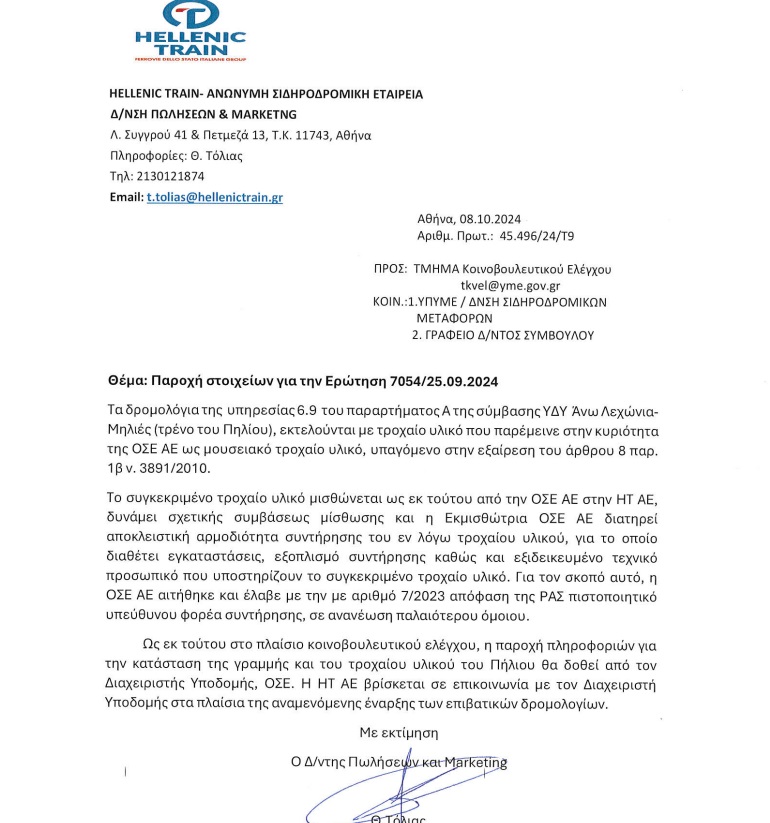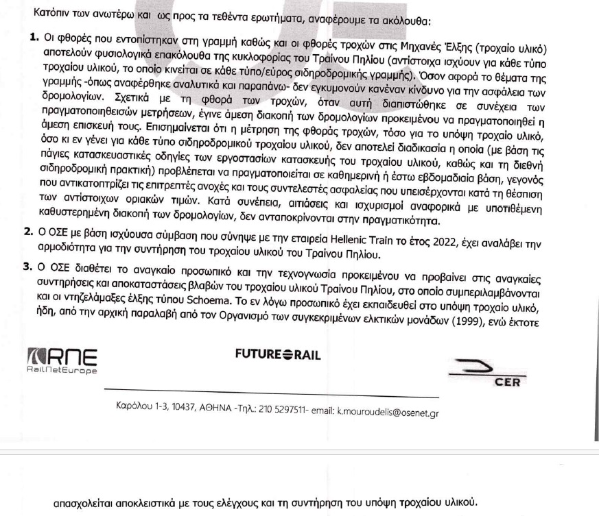 - Λαμβάνοντας υπόψη τις σημαντικές φθορές και βλάβες που εντοπίστηκαν από τις αρχές Αυγούστου στη σιδηροδρομική γραμμή του Τρένου του Πηλίου και στο τροχαίο υλικό και την απόκρυψη των αποτελεσμάτων των αυτοψιών από τη HellenicTrain ως μοναδικό πάροχο της γραμμής, προκύπτουν συμβατικές αλλά και ποινικές ευθύνες εκ μέρους του ΟΣΕ;