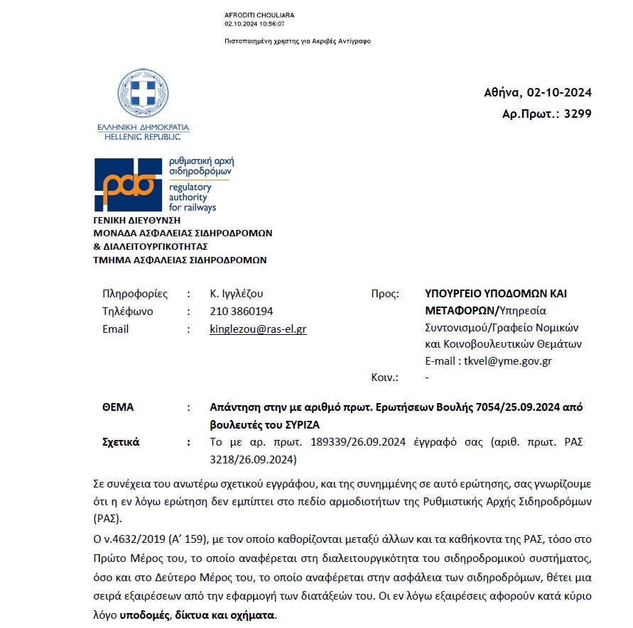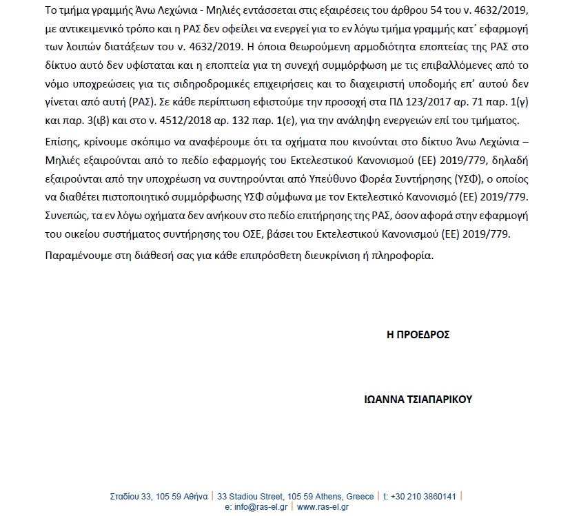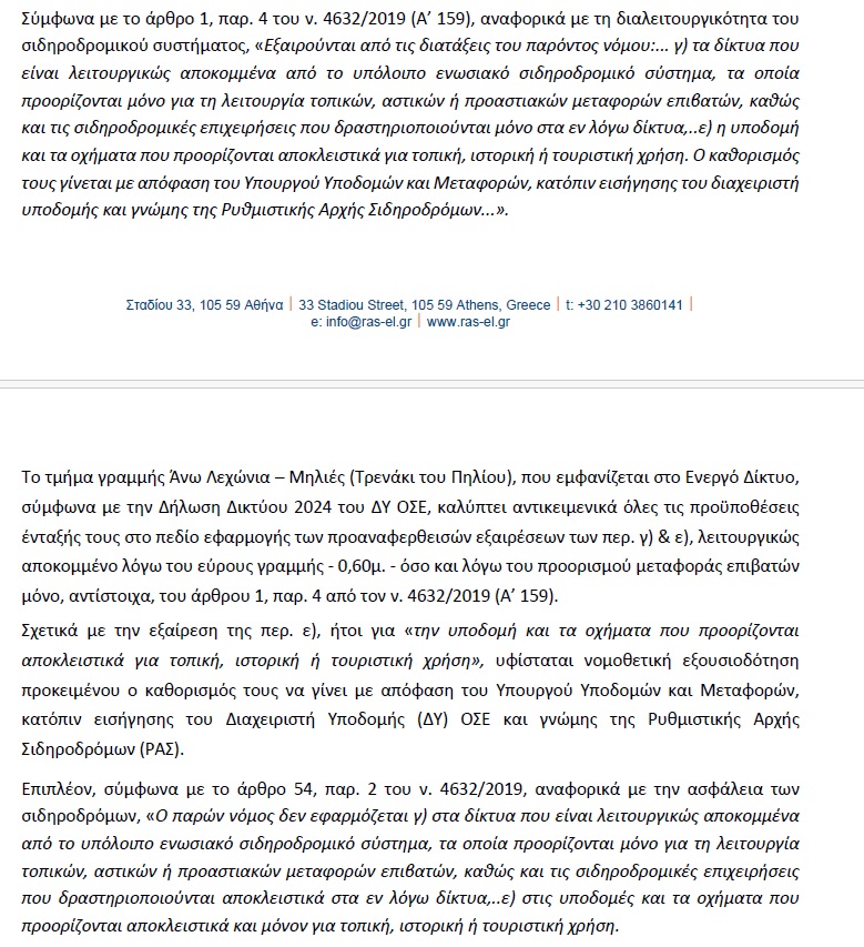 - Έχει ενημερωθεί η Ρυθμιστική Αρχή Σιδηροδρόμων για την επικινδυνότητα και την επισφάλεια με την οποία εκτελούσε μέχρι πρότινος τα δρομολόγια του το Τρένο του Πηλίου;