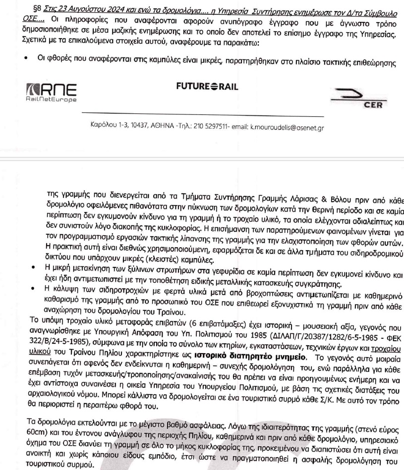 Στις 23 Αυγούστου 2024 και ενώ τα δρομολόγια του Τρένου του Πηλίου πραγματοποιούνταν καθημερινά μεταφέροντας πλήθος κόσμου, με το υπ. αριθμ. 68503/23.08.2024 υπηρεσιακό έγγραφο, η Υπηρεσία Συντήρησης Γραμμής – Τμήμα Γραμμής ΟΣΕ Βόλου, ενημέρωσε τον Διευθύνοντα Σύμβουλο του ΟΣΕ για συγκεκριμένα προβλήματα στη σιδηροδρομική γραμμή του Τρένου.