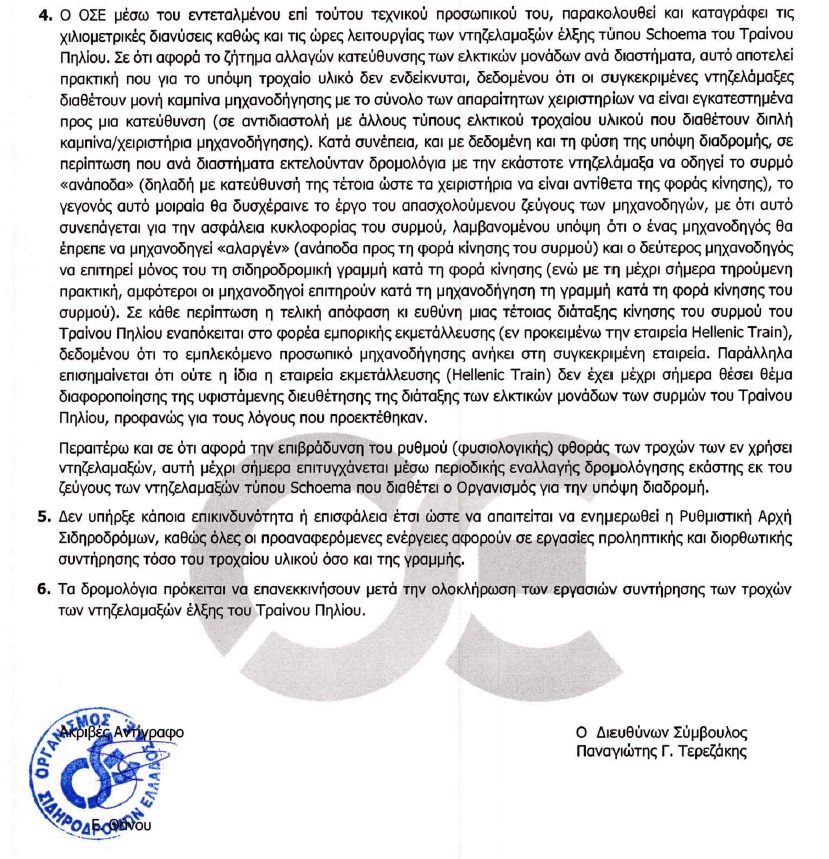 Η συστηματική απόκρυψη των βλαβών και των προβλημάτων της σιδηροδρομικής γραμμής του Τρένου του Πηλίου και η μη ενημέρωση της HellenicTrain ως μοναδικού παρόχου, συνιστά αντισυμβατική και παράνομη ενέργεια εκ μέρους του ΟΣΕ, που εγείρει και σαφείς ποινικές ευθύνες.