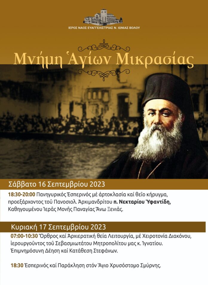 Εκπληρώνοντας την ετήσια οφειλή τιμής και ευγνωμοσύνης, η Τοπική Εκκλησία της Δημητριάδος θα τιμήσει και φέτος, το διήμερο 16-17/9, την μνήμη των Αγίων της Μικράς Ασίας, που θυσιάστηκαν υπέρ πίστεως και πατρίδος, κατά την Μικρασιατική Καταστροφή, του Περίβλεπτου Μητροπολίτου Σμύρνης Χρυσοστόμου και των λοιπών Ιεραρχών, Κληρικών και λαϊκών μαρτύρων της Γενοκτονίας των Ελλήνων της Ιωνικής γης.