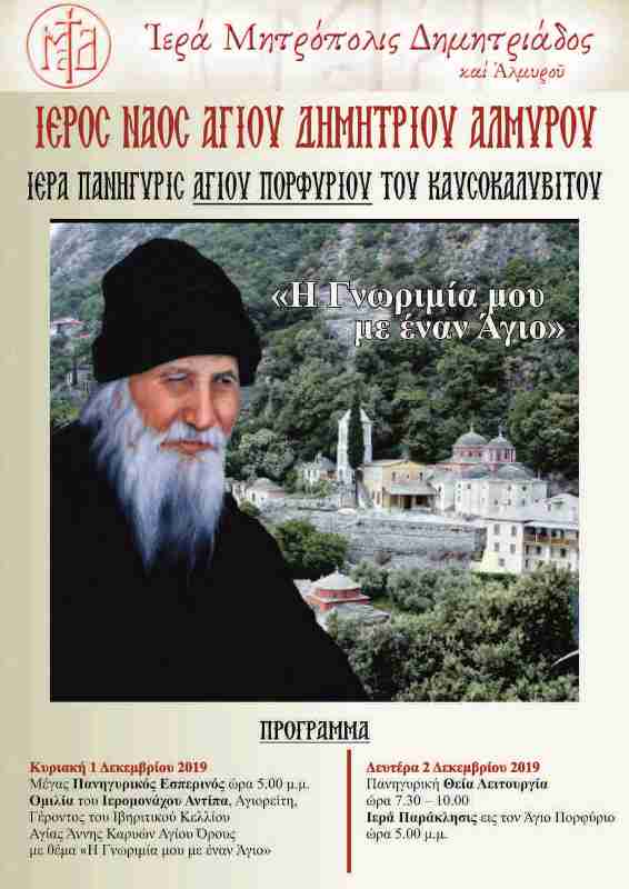 Η μνήμη του νεοφανούς Οσίου Πορφυρίου του Καυσοκαλυβίτου θα τιμηθεί στον Ιερό Ναό Αγίου Δημητρίου Αλμυρού, το διήμερο 1-2/12, κατά το ακόλουθο πρόγραμμα: Την Κυριακή 1η Δεκεμβρίου, στις 5.00μ.μ., θα τελεστεί ο Μέγας Πανηγυρικός Εσπερινός, κατά τον οποίο θα ομιλήσει ο Ιερομόναχος Αντύπας Αγιορείτης, με θέμα «Η γνωριμία μου με έναν Άγιο». Ανήμερα της εορτής θα τελεστεί Πανηγυρική Θεία Λειτουργία και στις 5.00μ.μ. η Ιερά Παράκληση στον Όσιο Πορφύριο