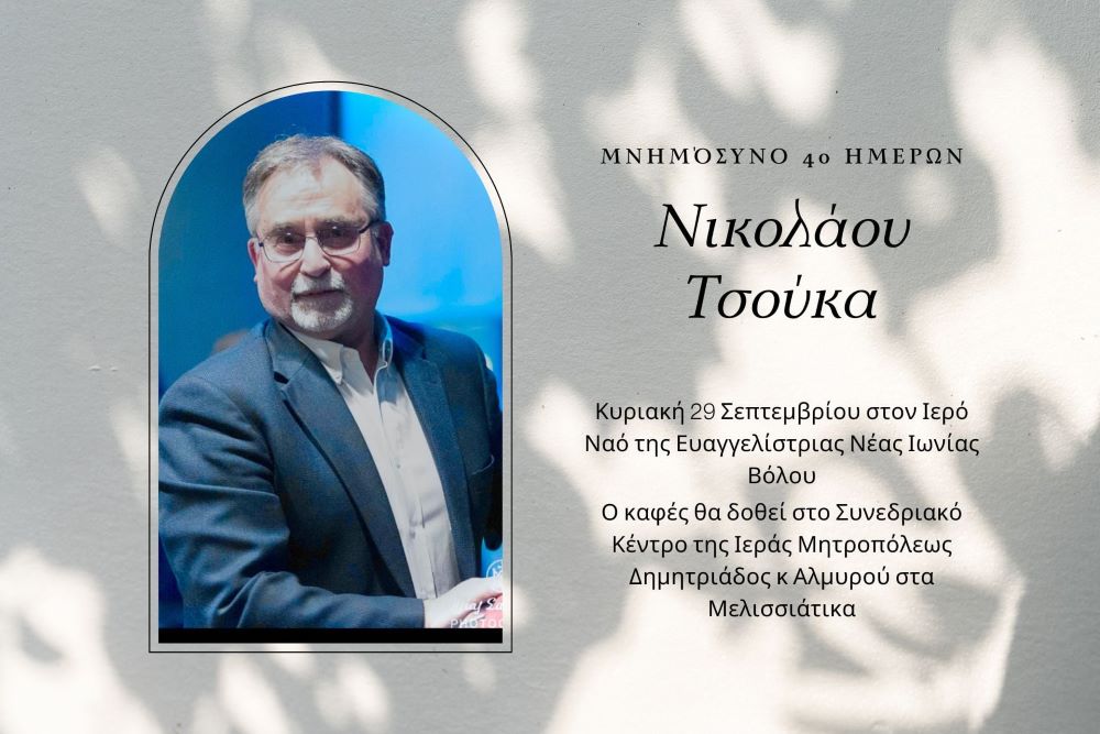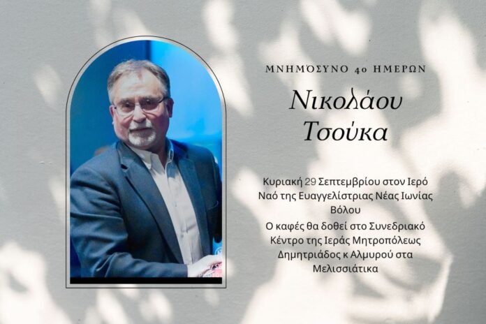 Την ερχόμενη Κυριακή 29 Σεπτεμβρίου στον Ιερό Ναό Ευαγγελιστρίας Νέας Ιωνίας Βόλου θα πραγματοποιηθεί το τεσσαρακονθήμερο μνημόσυνο της «ψυχής» της Μαγνήτων Κιβωτού, του αειμνήστου Νίκου Τσούκα.
