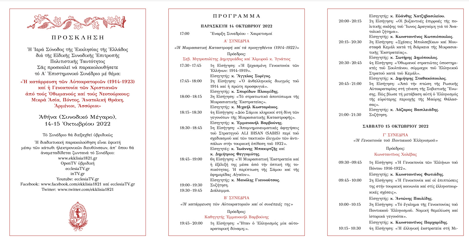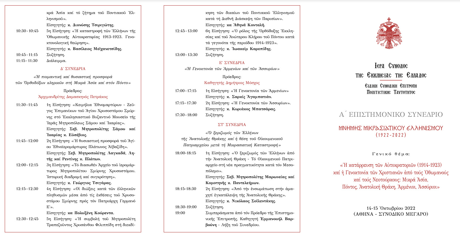 Η Ιερά Σύνοδος της Εκκλησίας της Ελλάδος, διά της Ειδικής Συνοδικής Επιτροπής Πολιτιστικής Ταυτότητος, διοργανώνει την Παρασκευή 14 και το Σάββατο 15 Οκτωβρίου το Α΄ Επιστημονικό Συνέδριο για την επέτειο των 100 ετών από τη Μικρασιατική Καταστροφή.