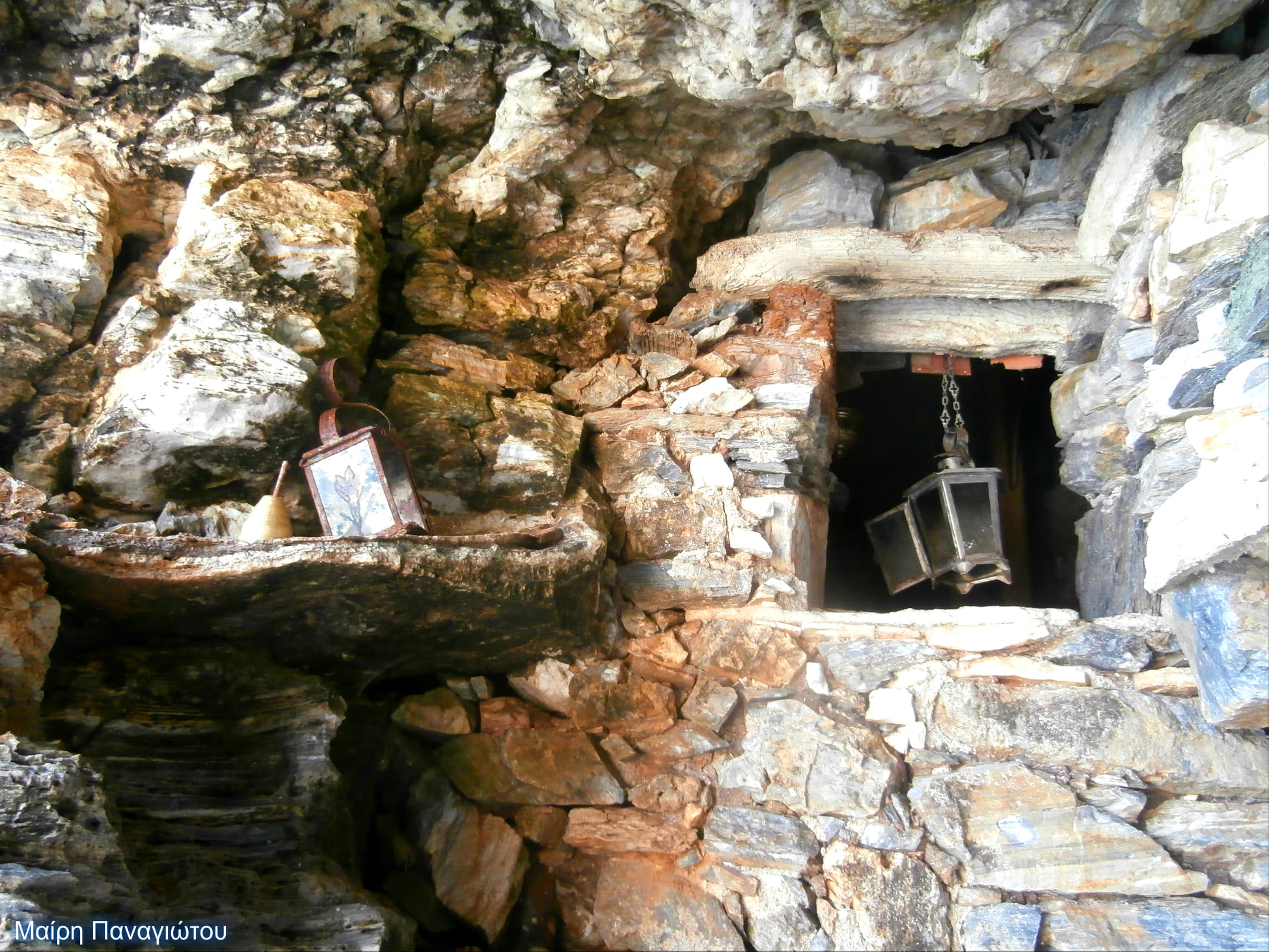 Κάτω από αυτό, στον βραχώδη κολπίσκο, υπάρχει σπηλιά, που προσεγγίζεται με βάρκα, στο βάθος της οποίας τρέχει γλυκό νερό και έχει και μερικούς σταλακτίτες. Παλιότερα φώλιαζαν και αγριοπερίστερα.